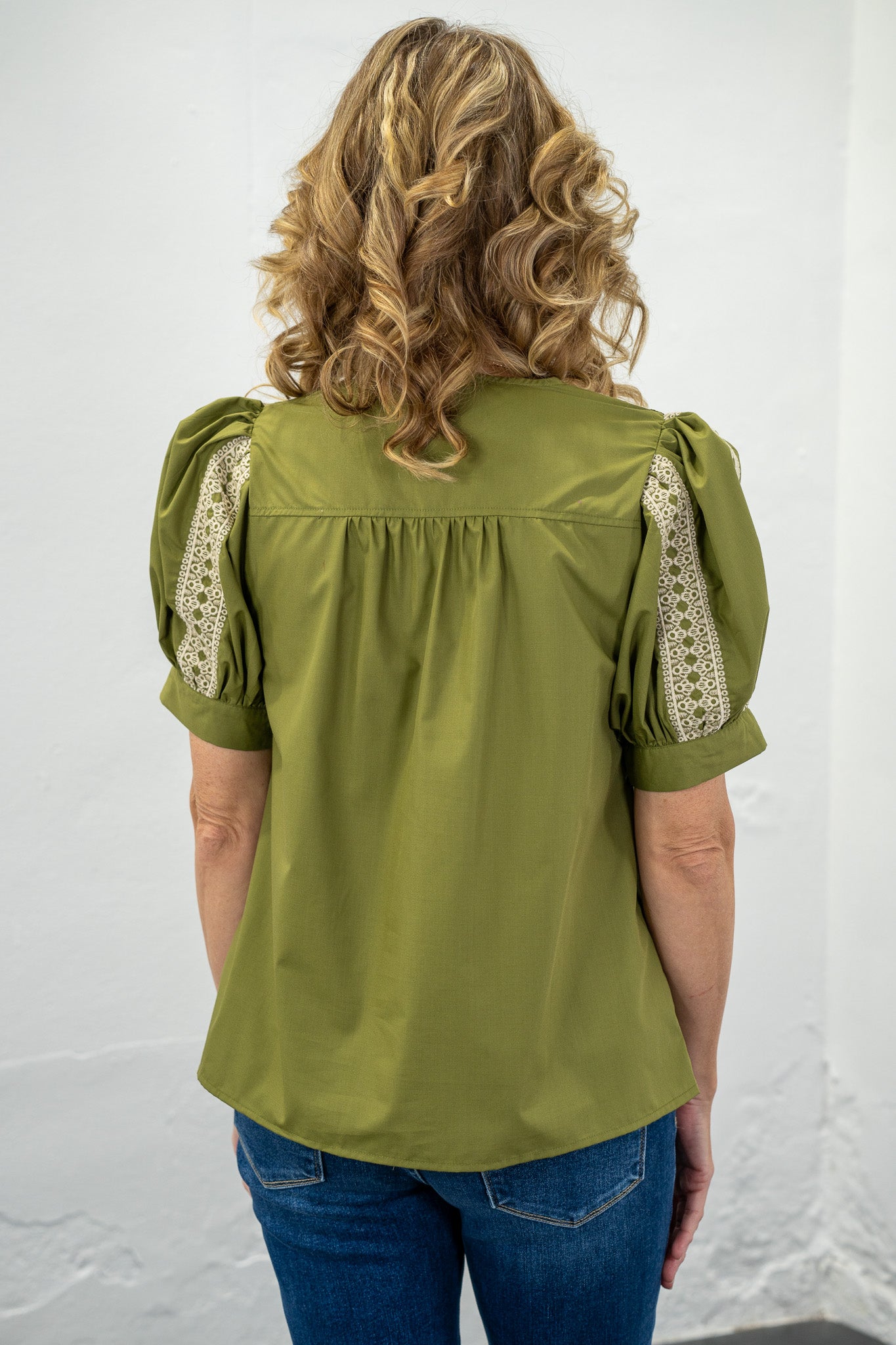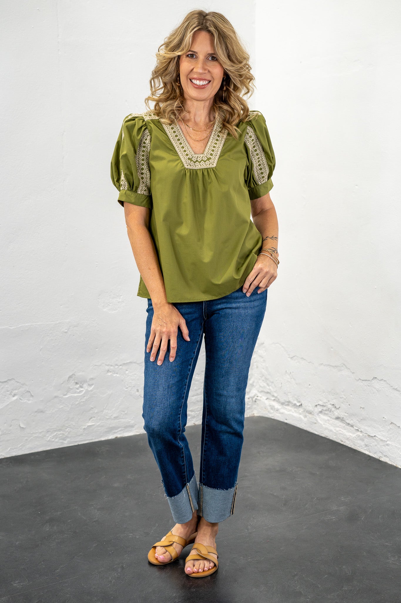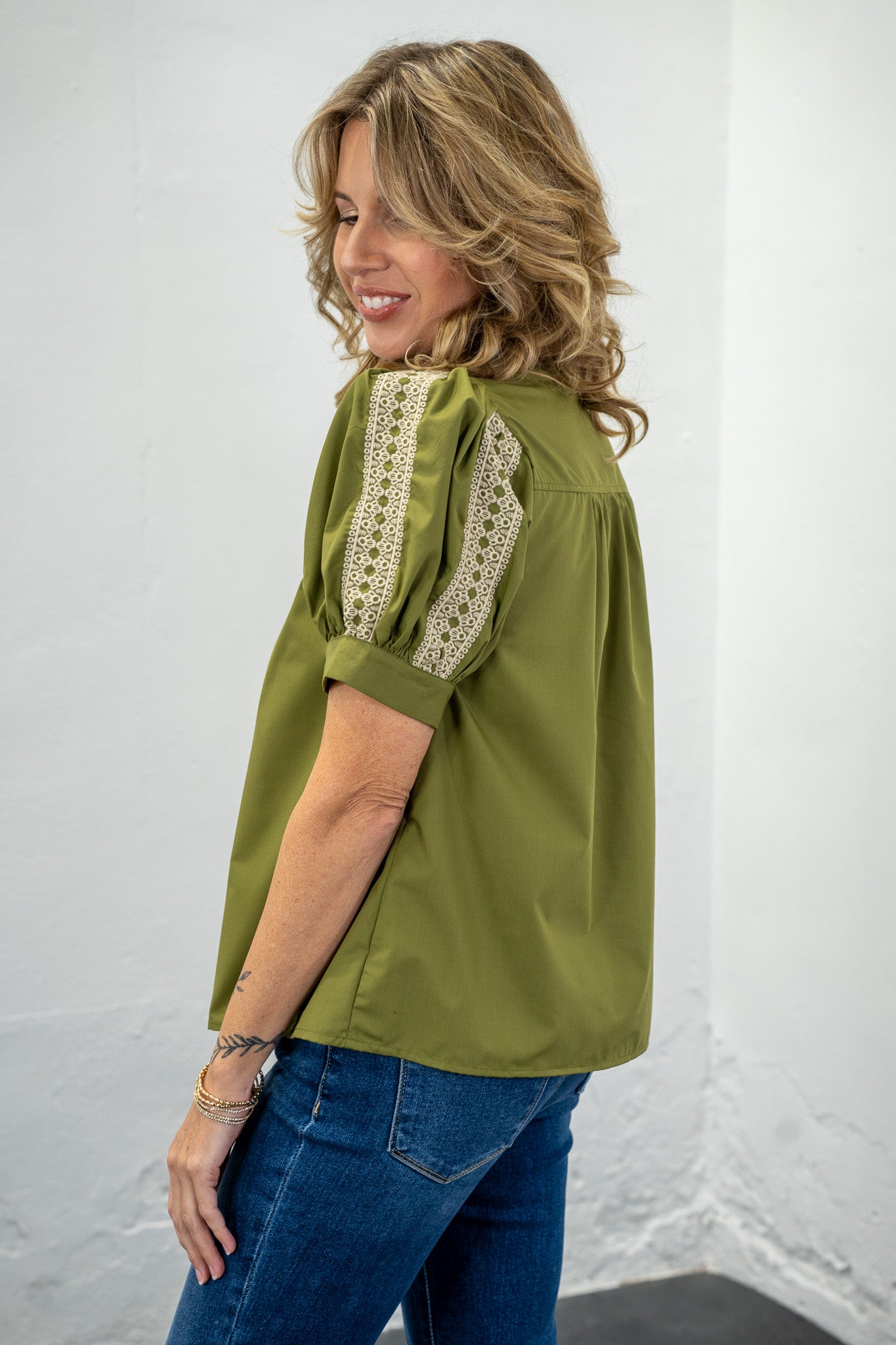 Green woven fabric with no stretch and the prettiest crochet accents!