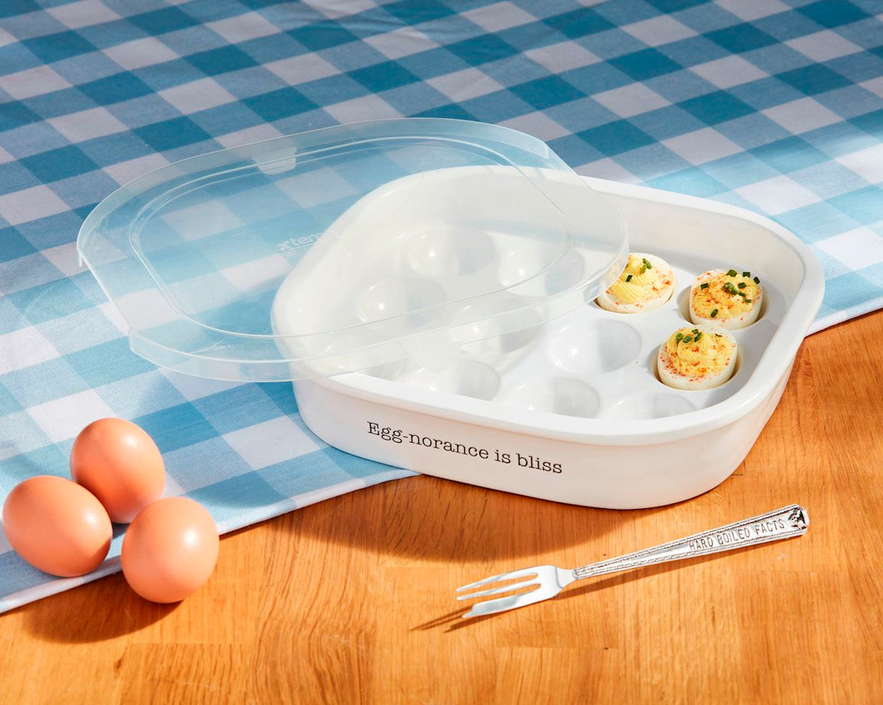 2-piece set. On-the-go ceramic deviled egg tray with plastic lid. Comes with stamped silverplate fork.