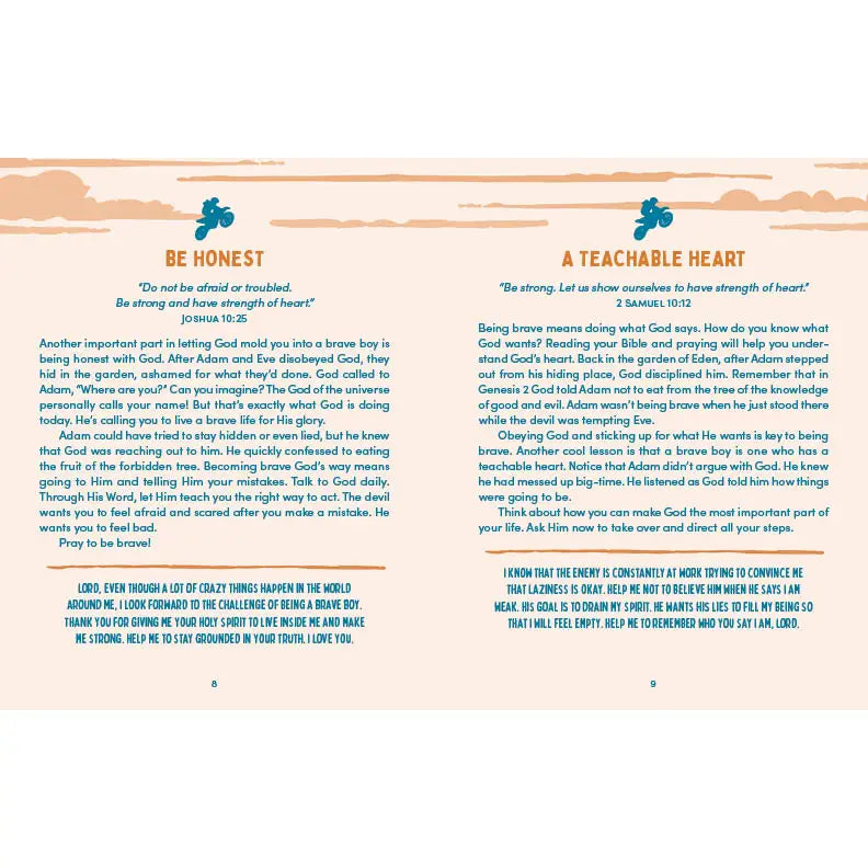 This courage-building devotional collection--created for your adventurous boys--offers a powerful blend of devotional readings and prayers alongside easy-to-understand scripture selections. Focusing on topics important to boys like Making "No-Regrets" Choices, Being Brave for God, Being Persistent, Talking to God, Telling the Truth, Being a Light, and more, these devotions will help nurture their faith right alongside their relationship with the heavenly Creator as He molds them mighty, brave-hearted boys!