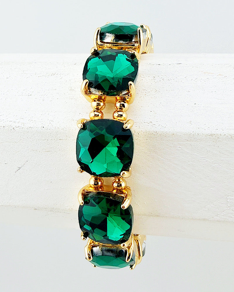 This bracelet will have you sparkling from all angles. Glam as a solo bracelet or perfect in a stack. Stretchy, golden beads & hardware, faceted oversized jewels. 1/2" wide