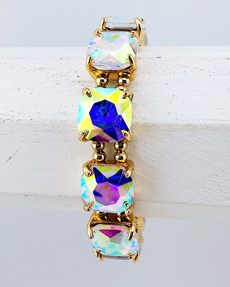 This bracelet will have you sparkling from all angles. Glam as a solo bracelet or perfect in a stack. Stretchy, golden beads & hardware, faceted oversized jewels. 1/2" wide