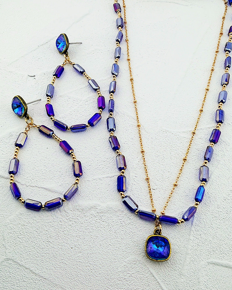 Striking fiery blue swarovski crystal pendant on a golden chain paired with glass beads. Lobster clasp, adjustable! We have earrings to match!!