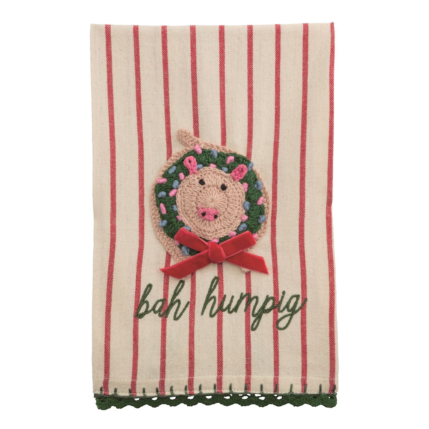 Embroidered cotton hand towel features crochet appliqué and hem trim.