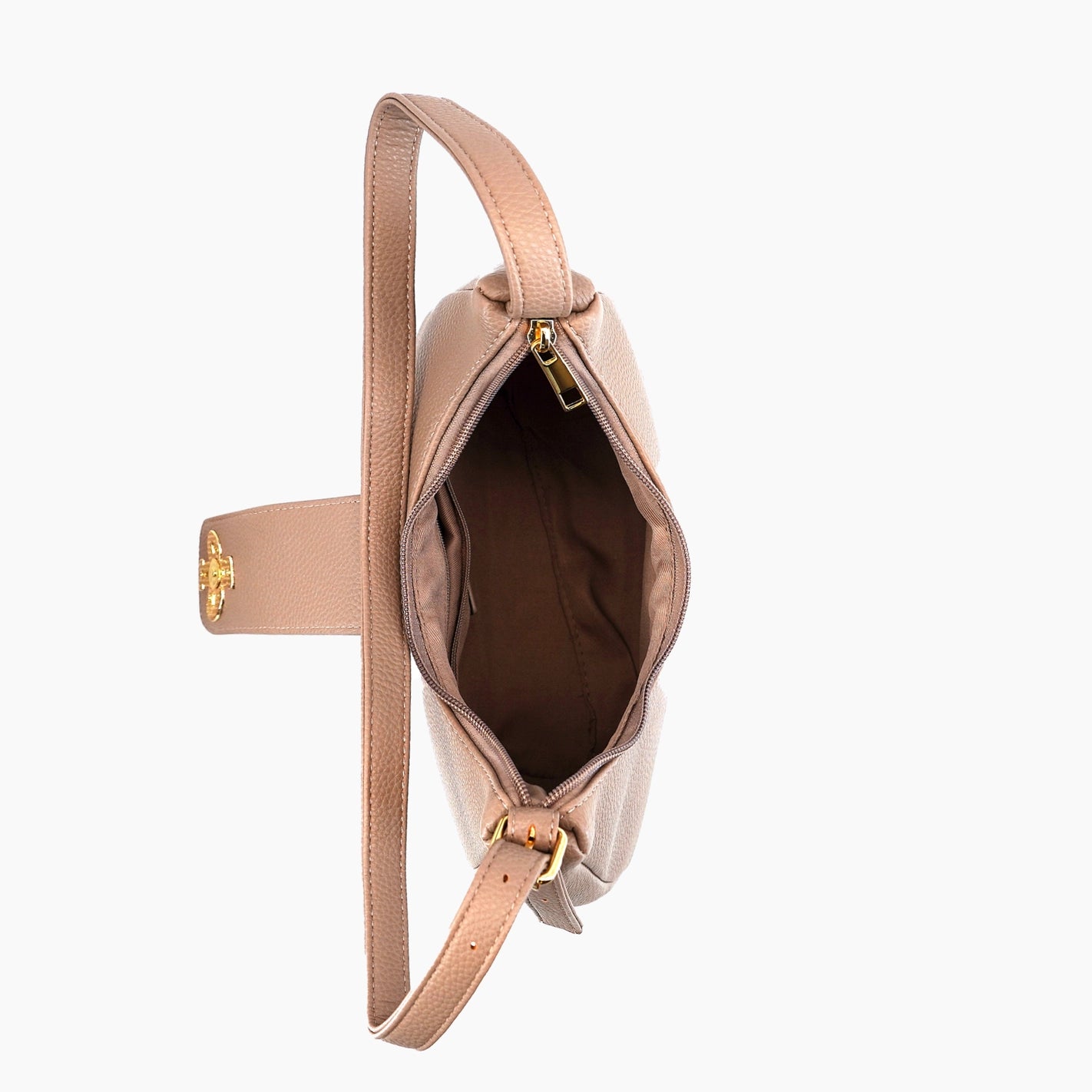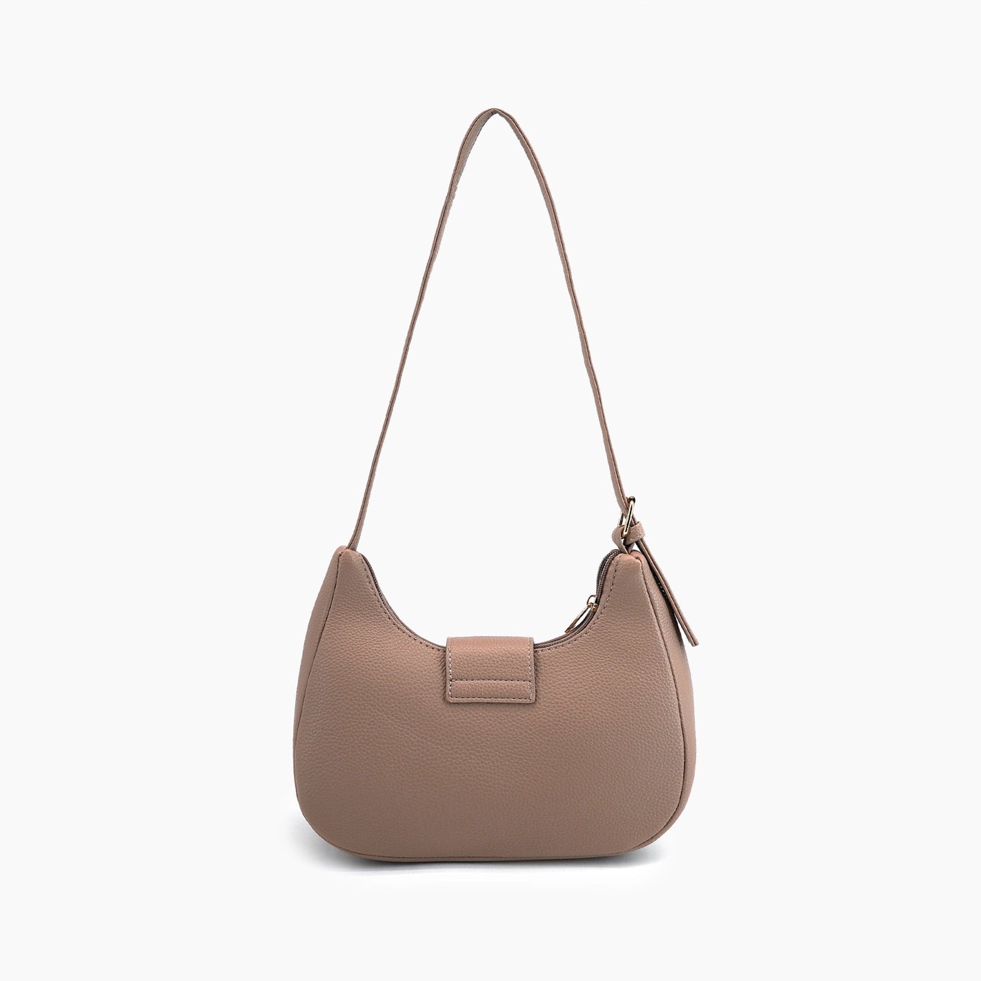 Introducing the Felicity shoulder bag that combines a trendy moon shaped silhouette complemented by its elegant pebble vegan leather composition. Front flap magnetic closure for extra security into a compact interior perfect for storing your essentials. A go to purse for any occasion this Spring season.