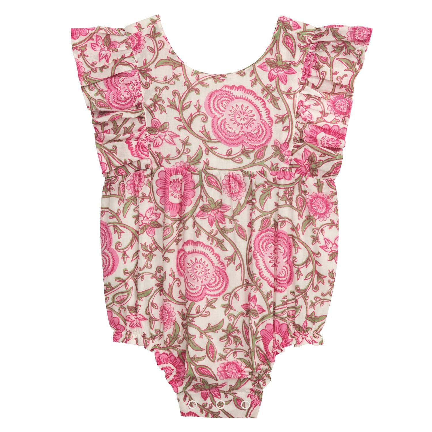 Cotton voile bubble features ruffle shoulders and elastic back waist with coconut wood buttons to secure straps. Inner leg snaps.
