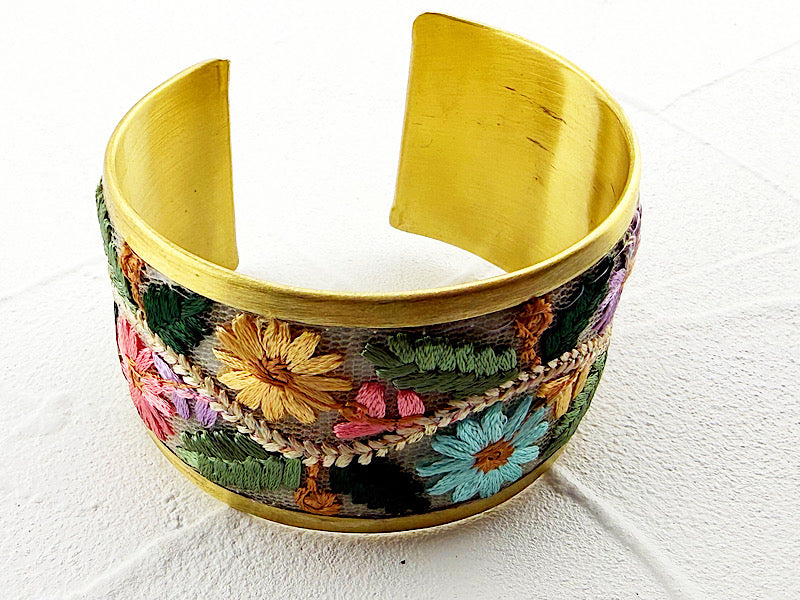 Wrap your wrist in nature’s beauty with this pastel flower and vine embroidered fabric cuff bracelet. The intricate thread embroidered design of delicate ivory pink, purple or blue flowers and leaves brings a soft, romantic touch, all set against a gleaming gold cuff. 1-3/8" wide. Each cuff is handmade & the floral design varies slightly.