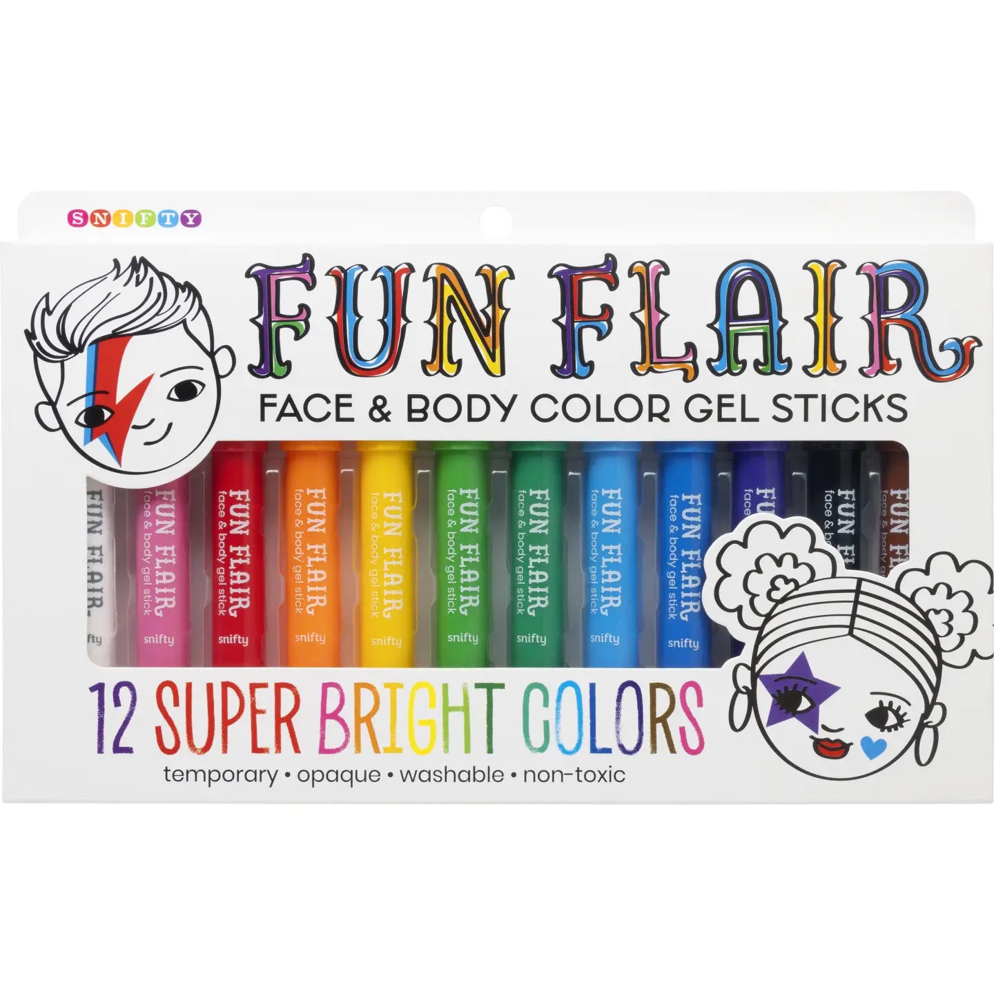 Colorful gel sticks let your hair and body be your canvas! Vibrant opaque color goes on smooth washes off easily with soap & water. Washable, Non Toxic , Set of 12.