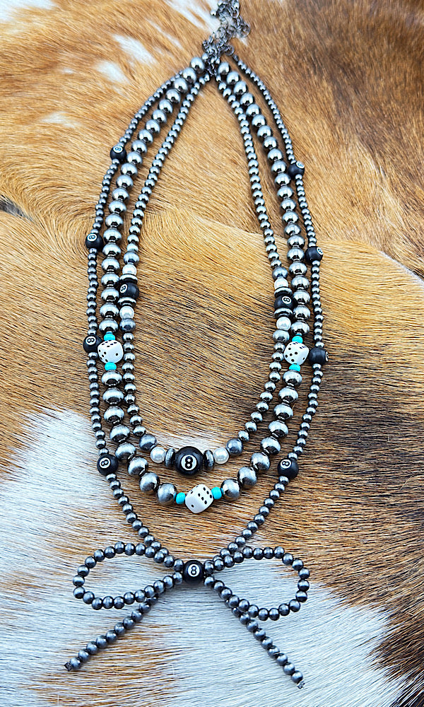 We've got the perfect trio of necklaces....combining pewter navajo pearls, lucky dice & magic 8 balls. Accented with tiny turquoise beads & pearls. All 3 are adjustable!