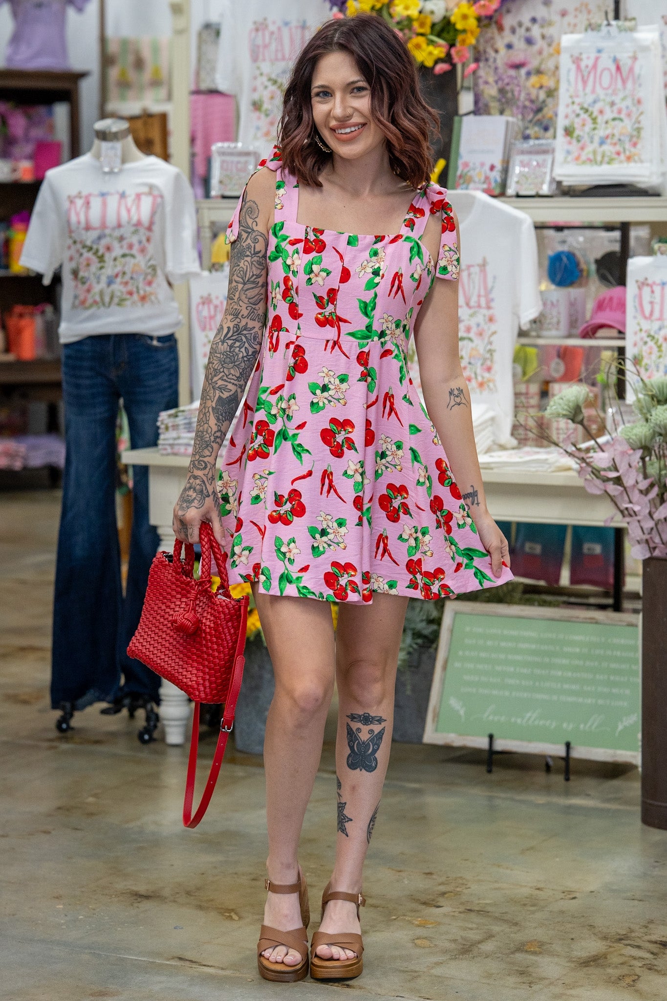 Fun designs of garden inspired details make this a one-of-a-kind dress. Soft pink hue with bright red tomatoes and peppers, soft cream floral and bold green leaves take you straight to the Garden Party of your dreams.