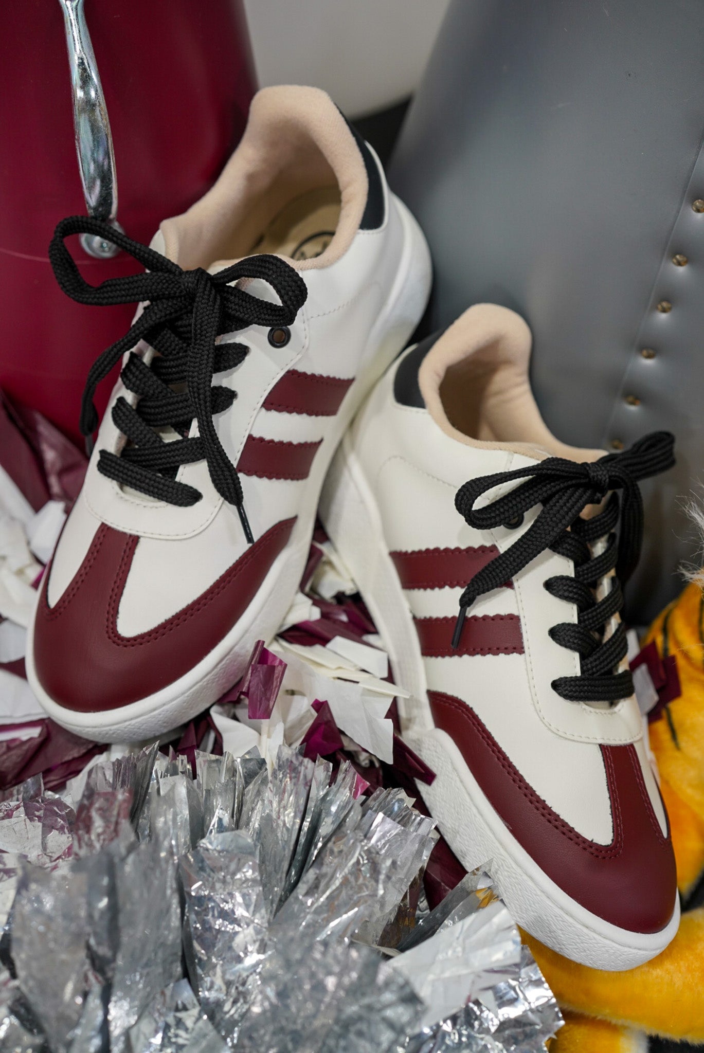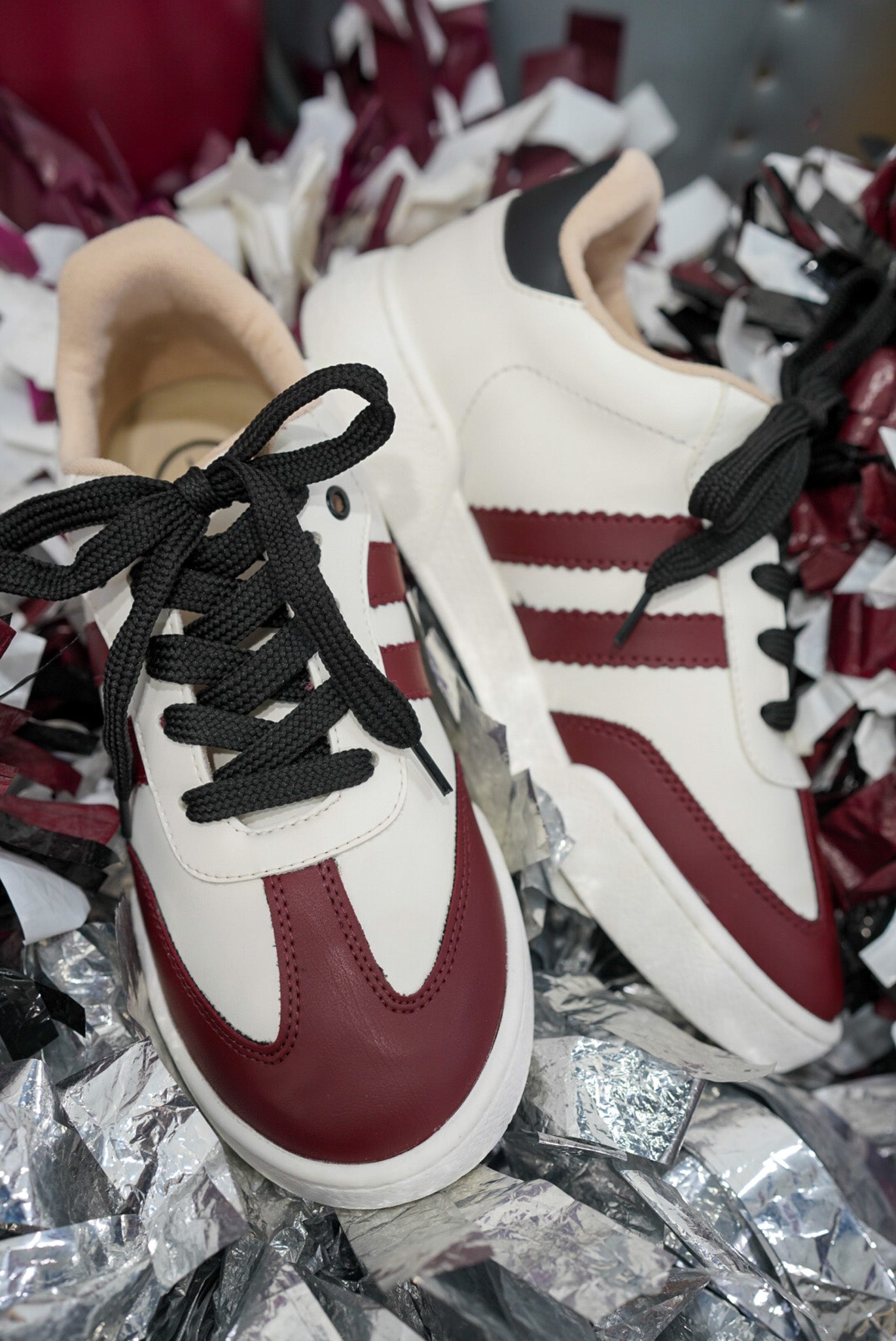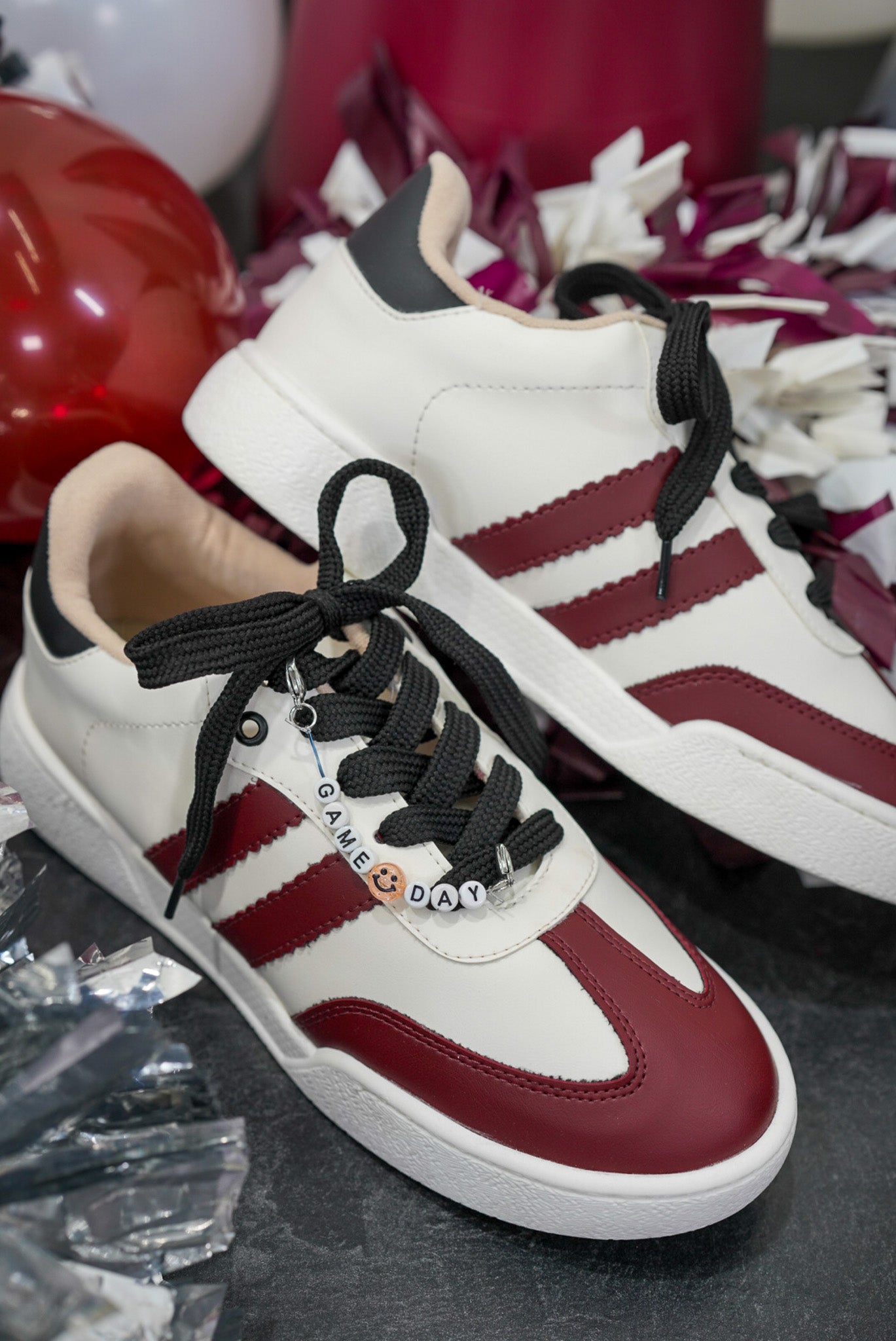 Meet the GIA GAMEDAY SNEAKERS-where sporty vibes meet street-chic style. Withy a classic cream base, bold maroon racing stripes and sleek black laces, these sneakers are a timeless staple with a modern twist. The cushioned beige lining adds comfort, while the included custom charm letters let you personalize your pair for that extra flair. Whether you're running errands or stepping out in style, GIA is your go-to girl!