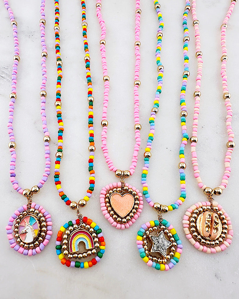 Sweet little beaded necklace with bead & enamel pendant. Adjustable from 14-17"