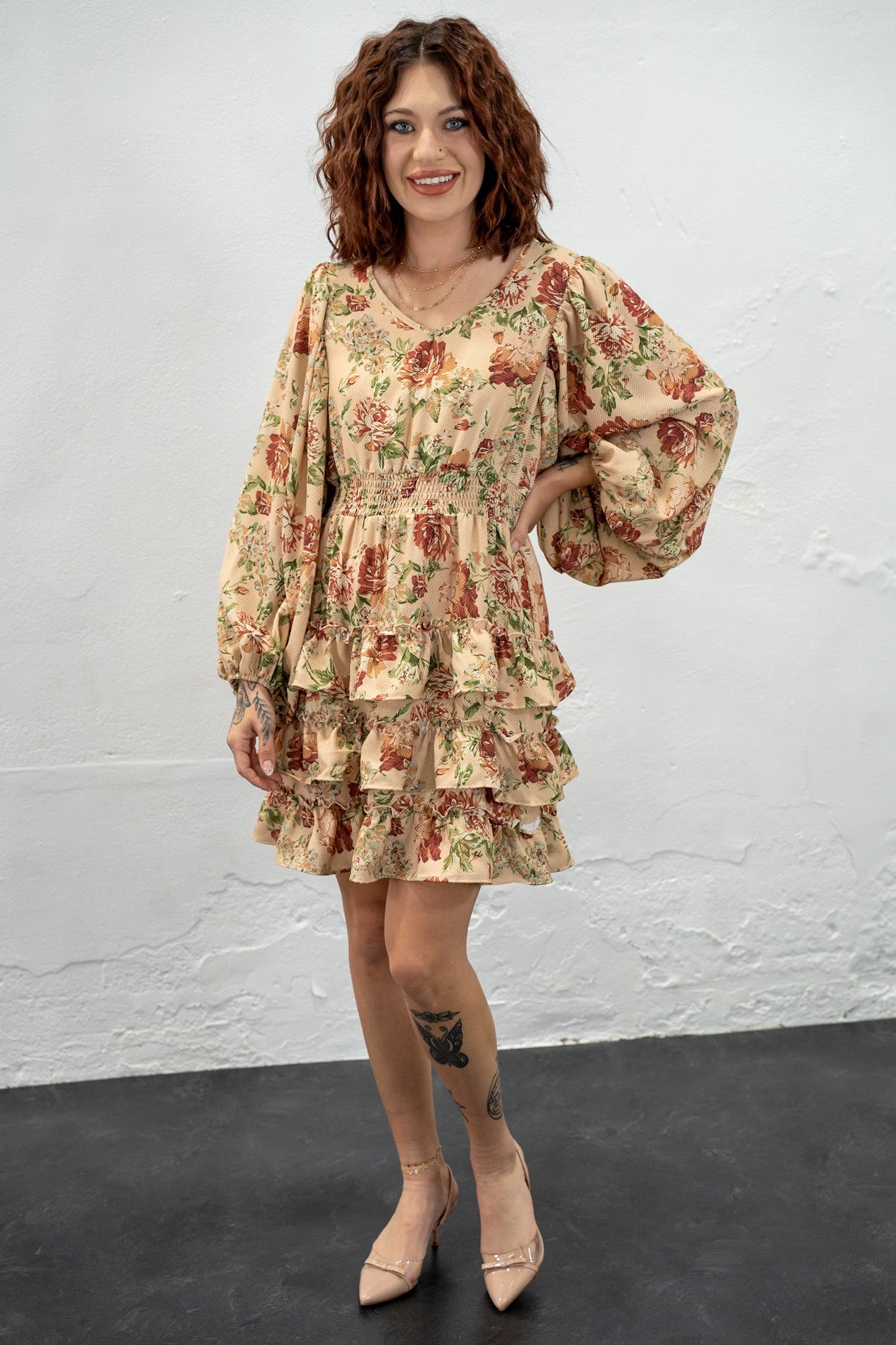Meet the Golden Garden Ruffle Dress your go-to for holiday parties! Covered in warm autumn kisses tones, and soft feminine ruffle details, this dress brings the perfect balance of charm and flare!