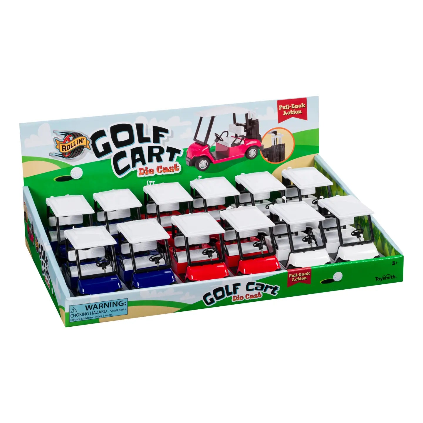 A new pull-back toy from Rollin', the Golf Cart toy comes in 3 colorful options with pull-back motion and functioning doors. Each one is made of high-quality die-cast metal and plastic materials. Each golf cart has a white top, a solid-colored base of red, blue, or white, and features a black frame, steering wheel, black dashboard, and white seats.
