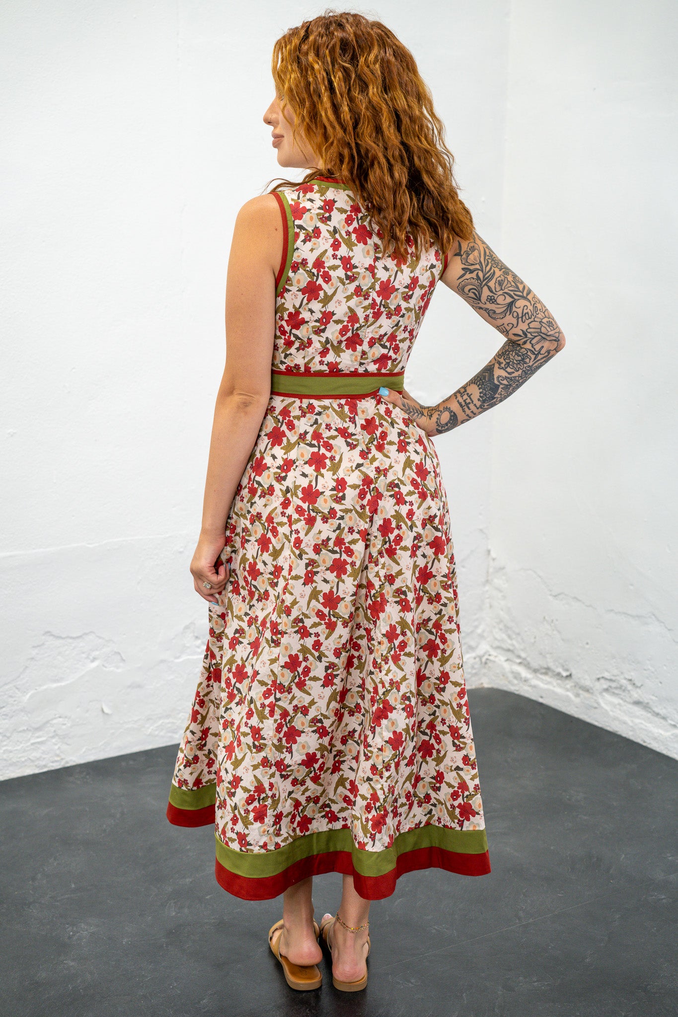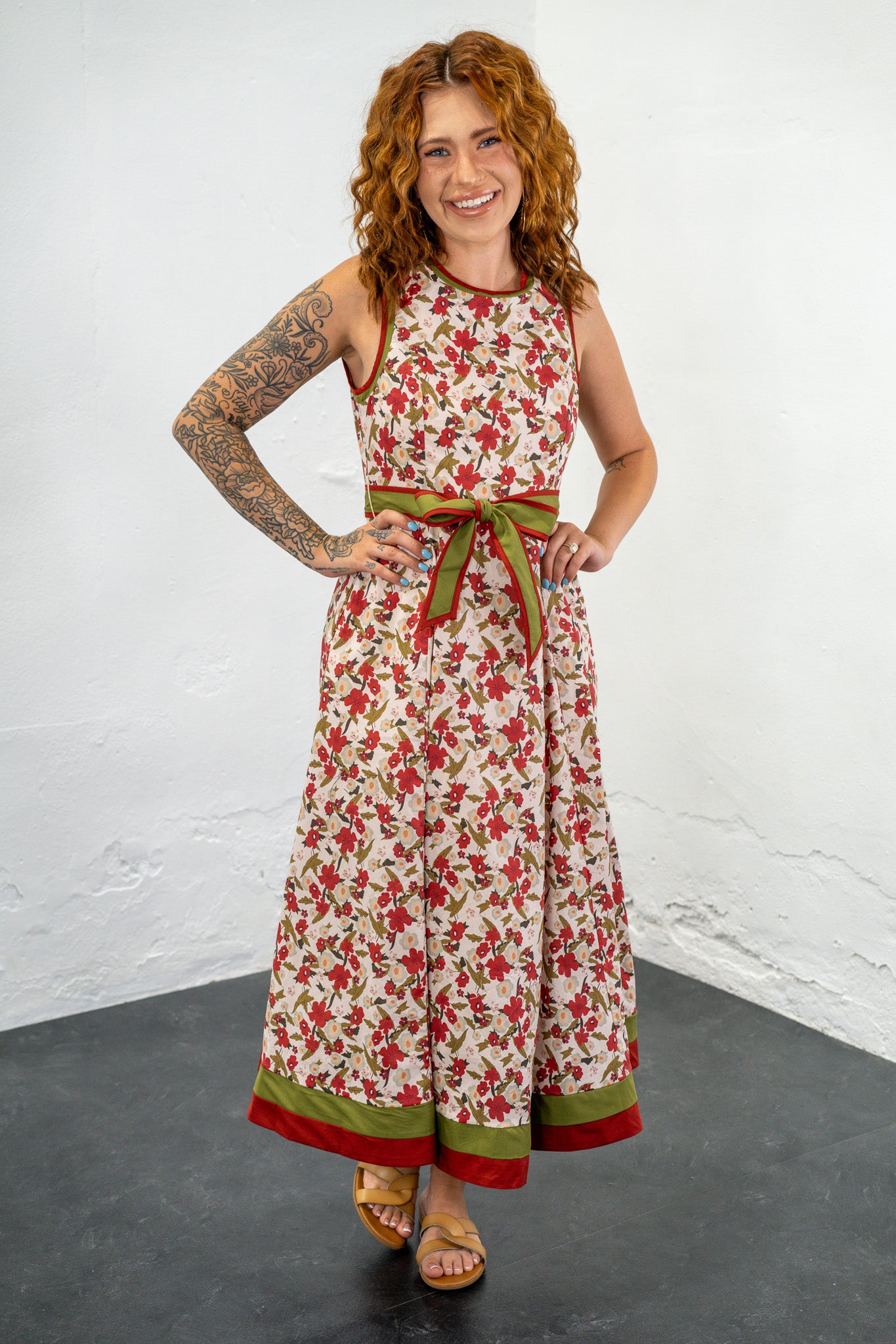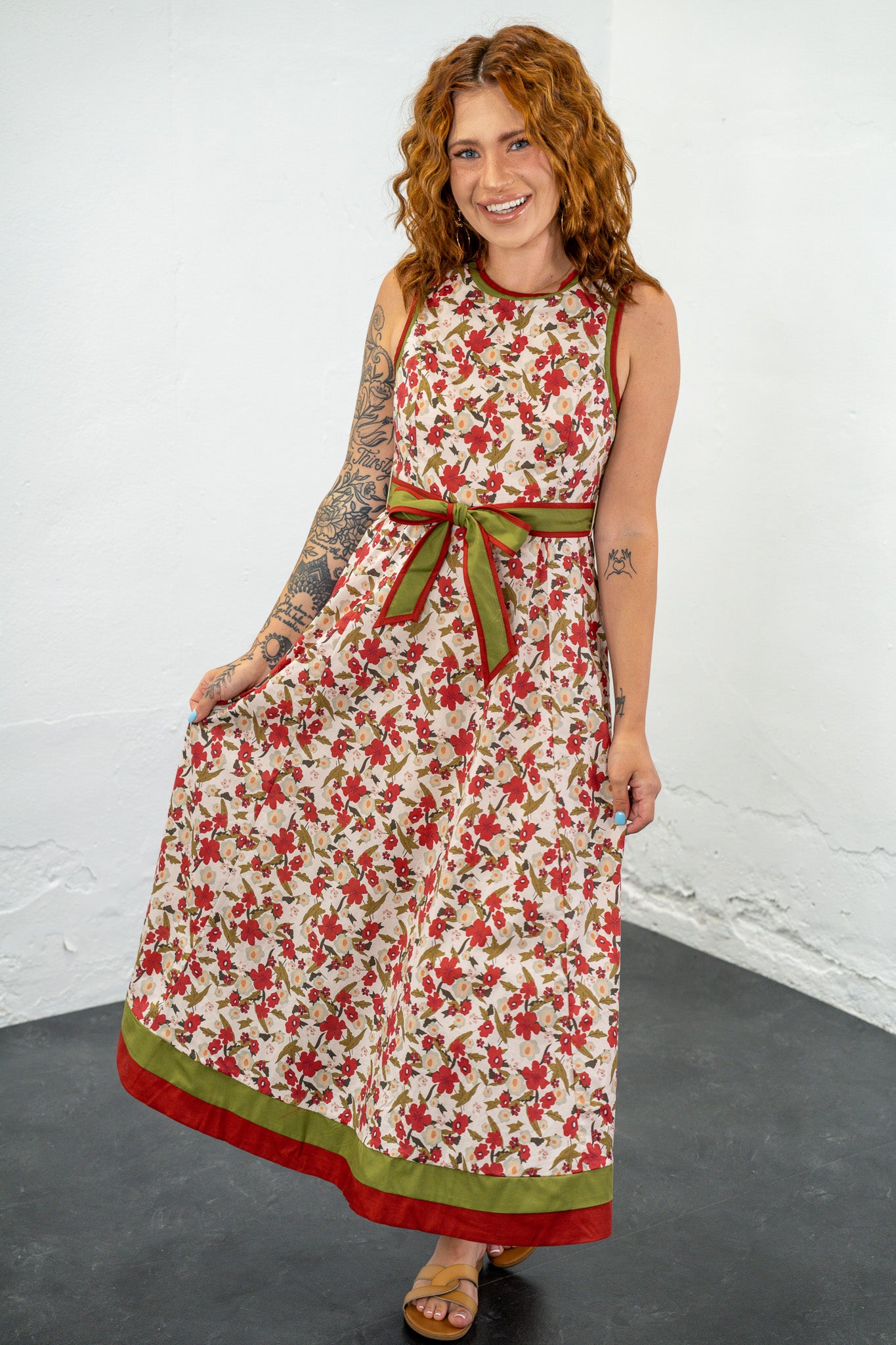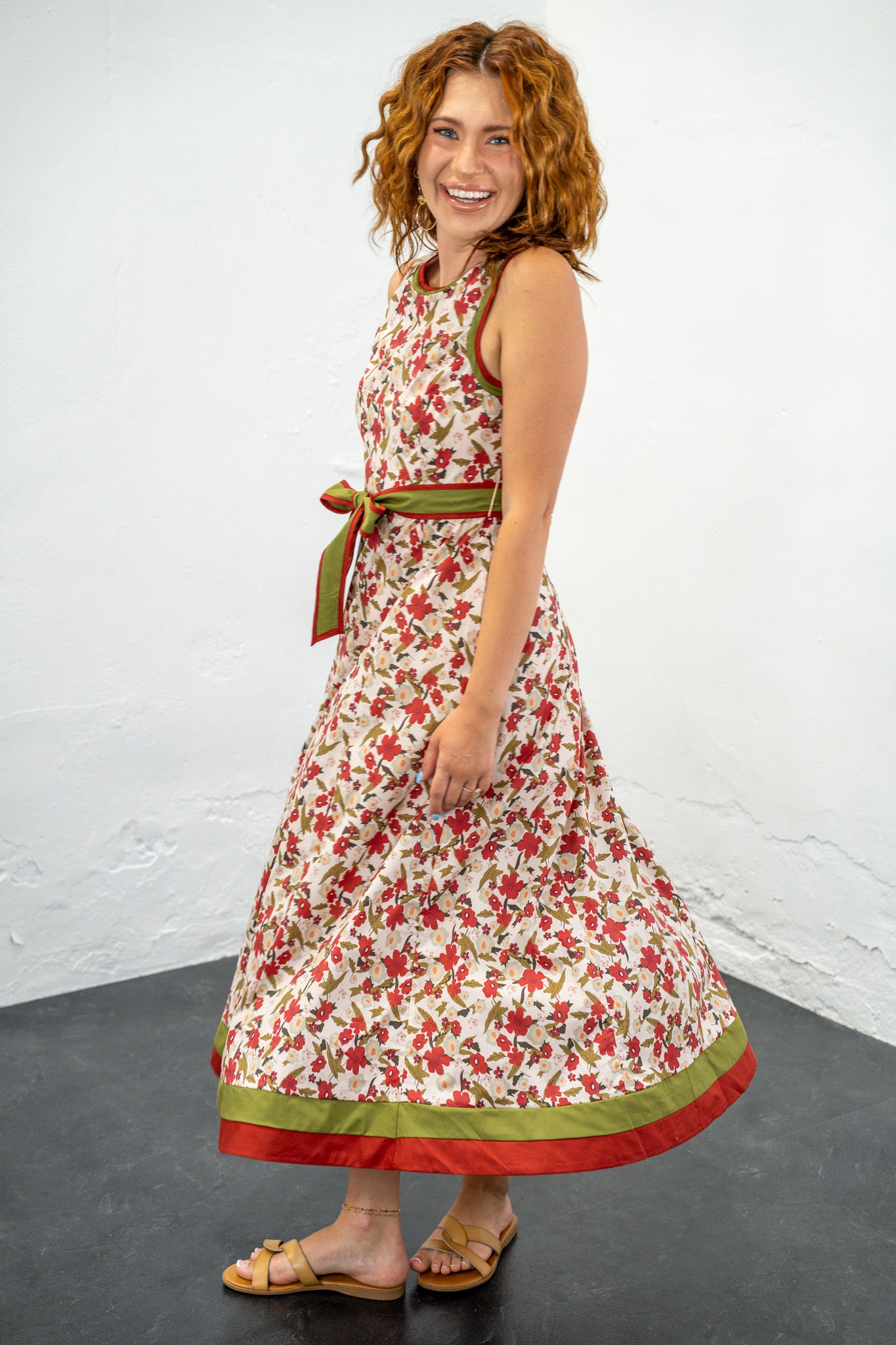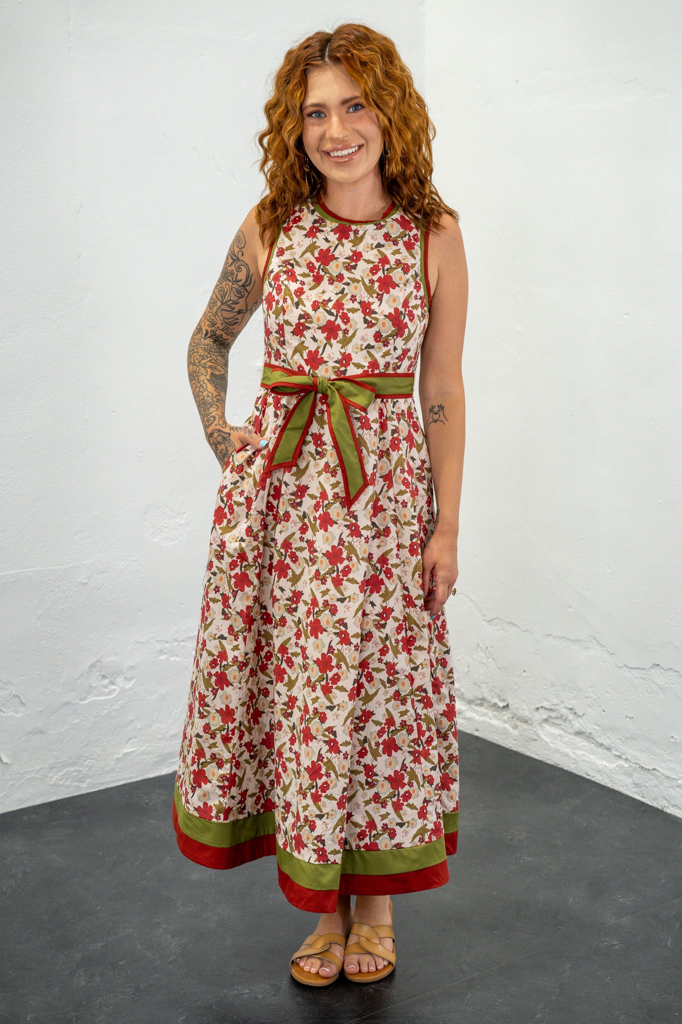 High neck, tank style straps with contract trim and the coordinating tie waist.