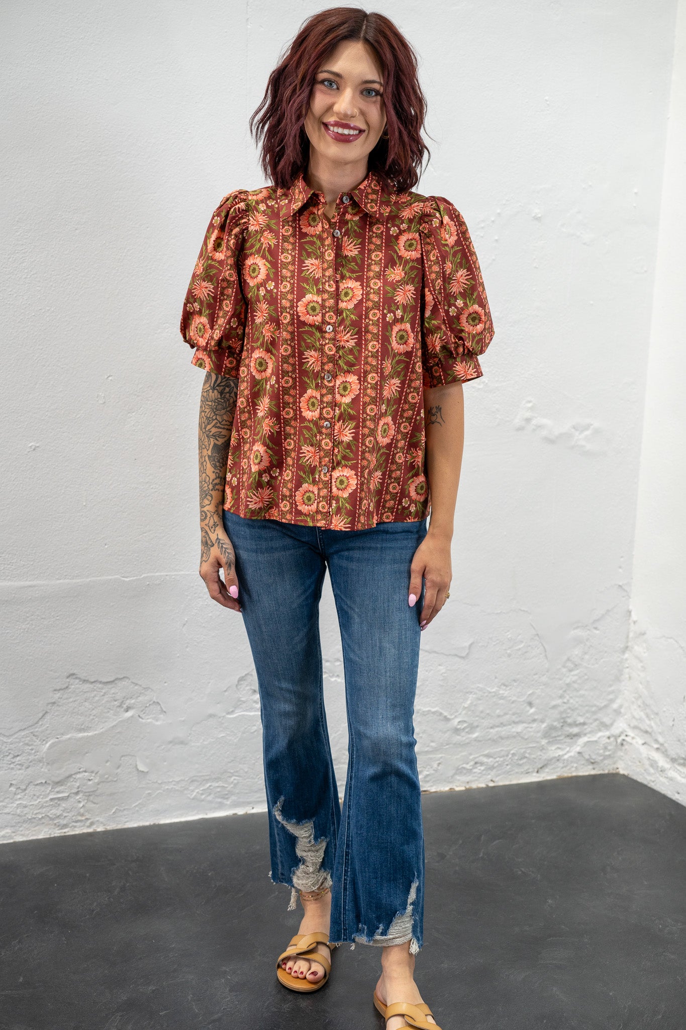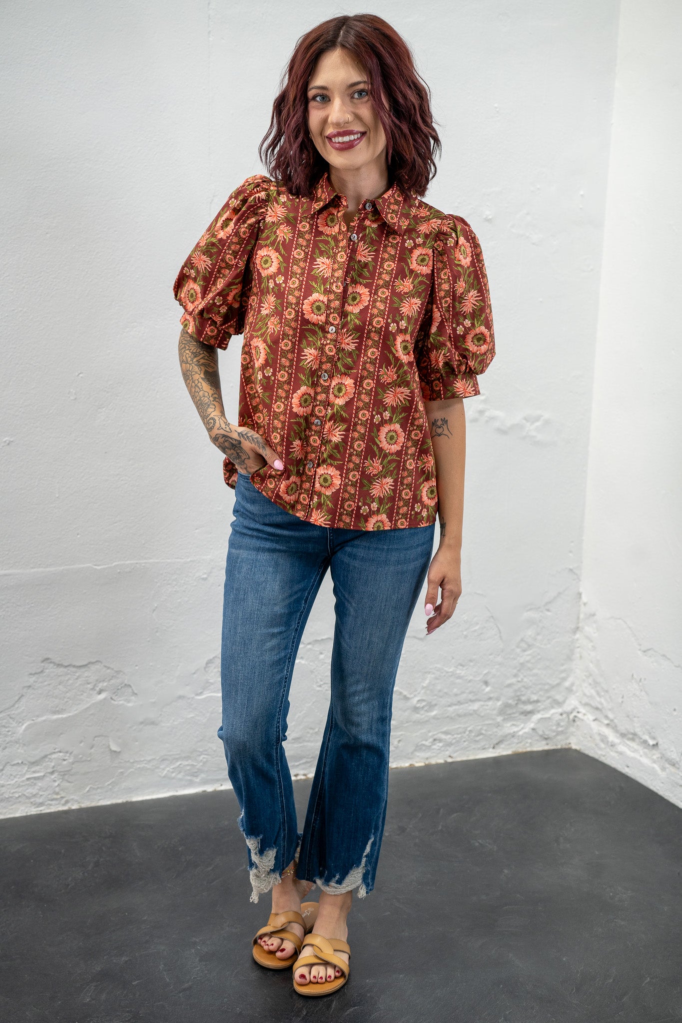 We're loving all the fall hues in store right now! Our Harvest Blooms Button-Down Top is the perfect piece for all your events this fall and winter!