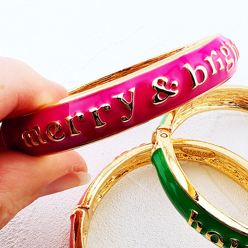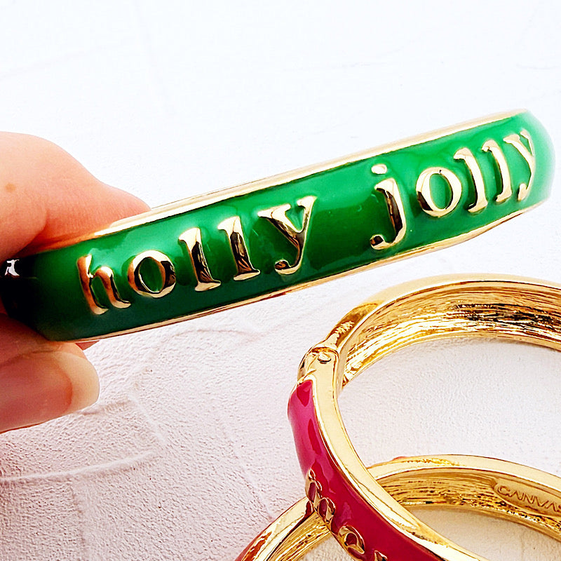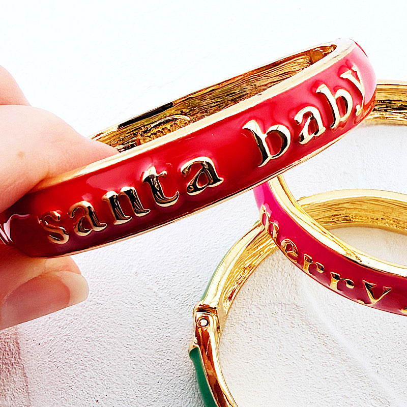 Get jolly with this enamel bangle that spreads cheer. A perfect finishing touch to your seasonal stack. Choose from Santa Baby, Merry & Bright & Holly Jolly.