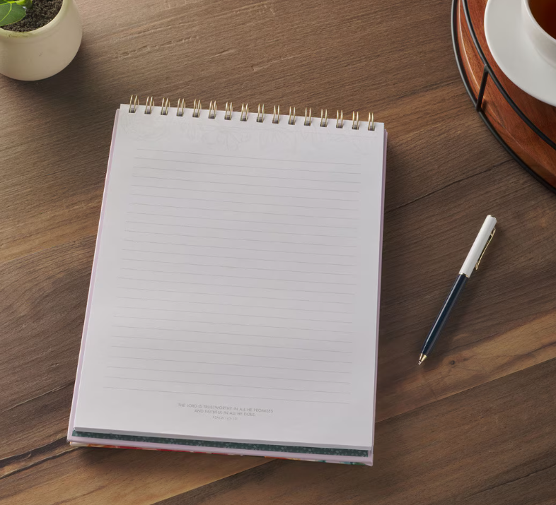 The notepad is bound at the top with a sturdy gold wire. The double o-wire makes it easy to flip over pages. It has 80 lined double-sided pages, each featuring a Scripture verse at the bottom.