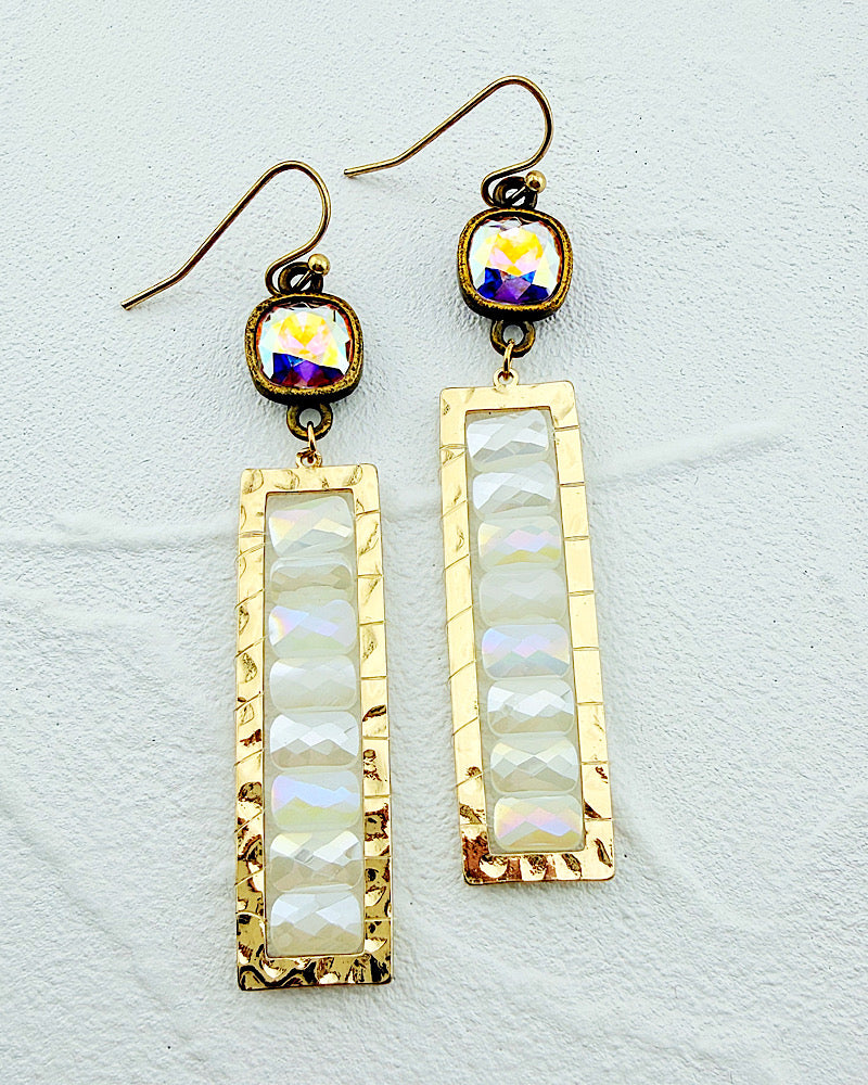 Isabella combines modern & classic touches. A linear hand-wrapped beaded drop with fiery iridescent cushion cut swarovski crystal accent. French wire style, 2-1/2" drop.