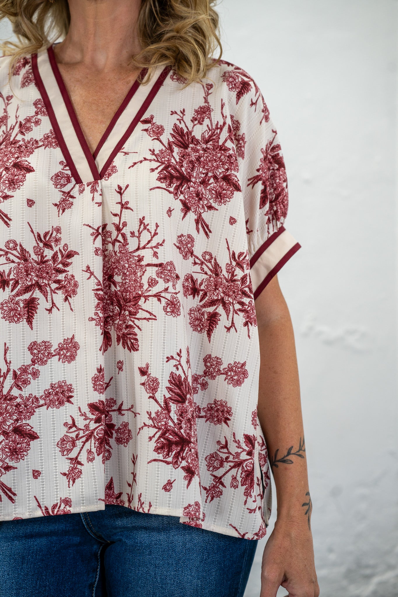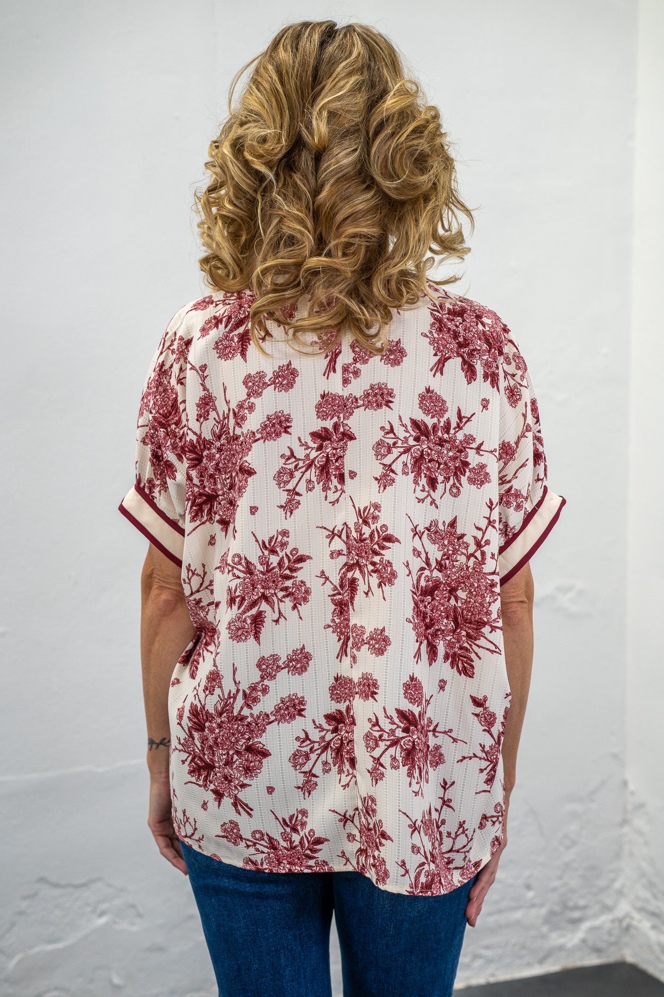 Off-white background with burgundy florals throughout! The sporty sleeves and neckline add that unique touch.