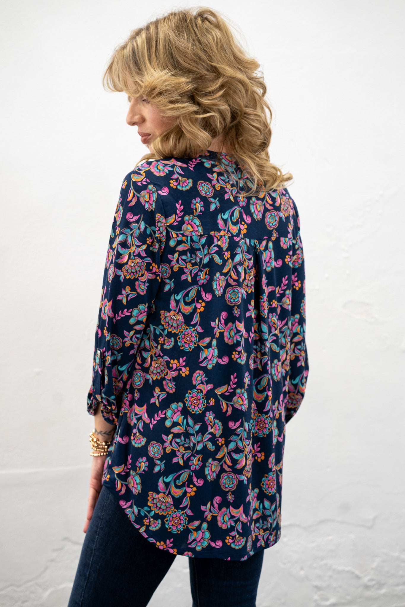 V-neckline, stunning florals and 3/4 sleeves with a gathered button!