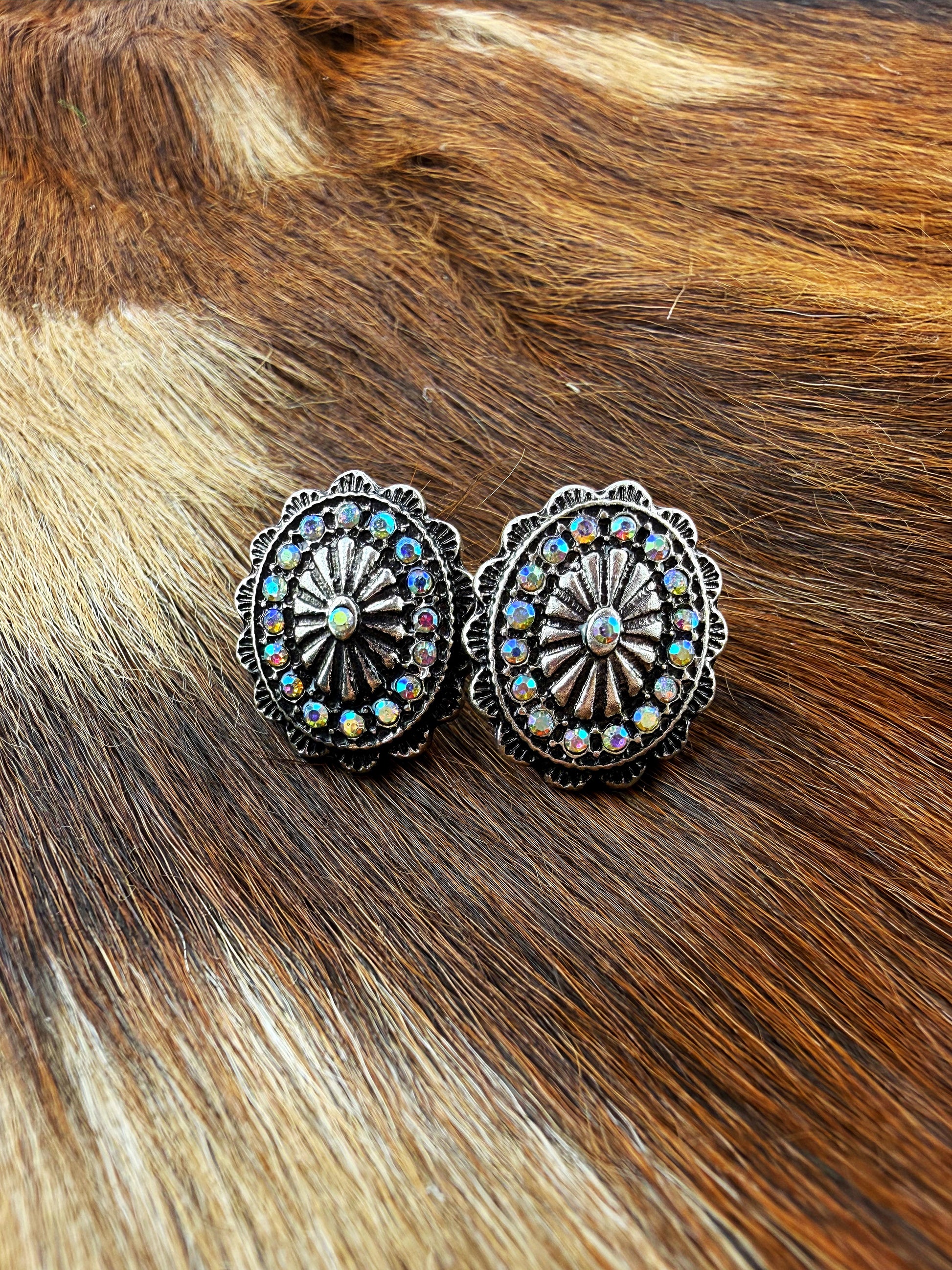 A dainty concho earring you can pair with everything. Antique silver finish & dotted with iridescent bling. Post style, 5/8"