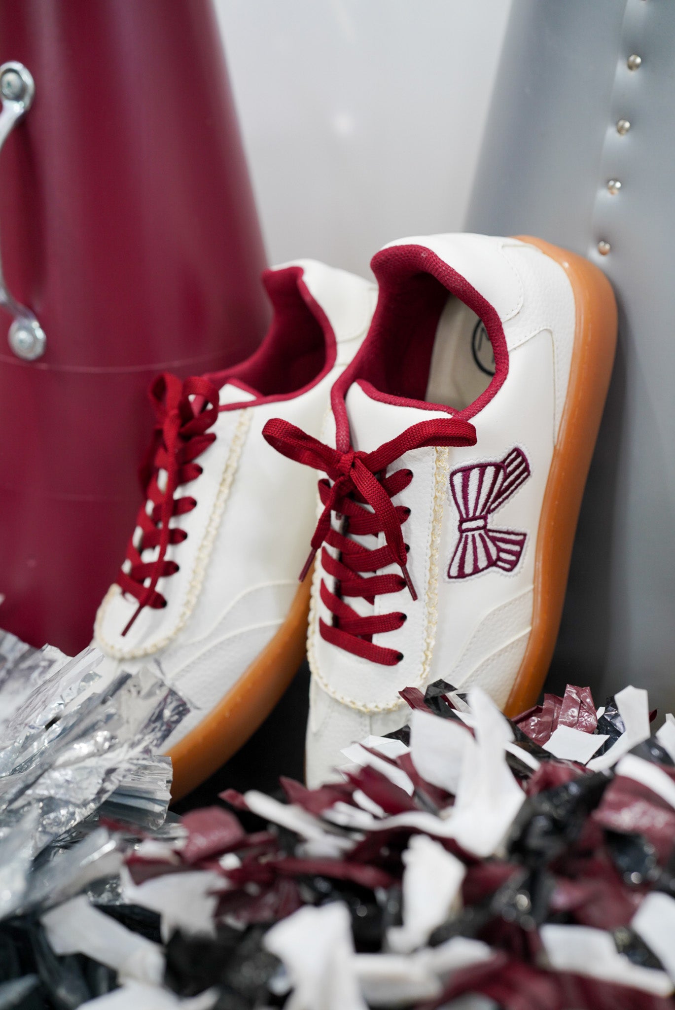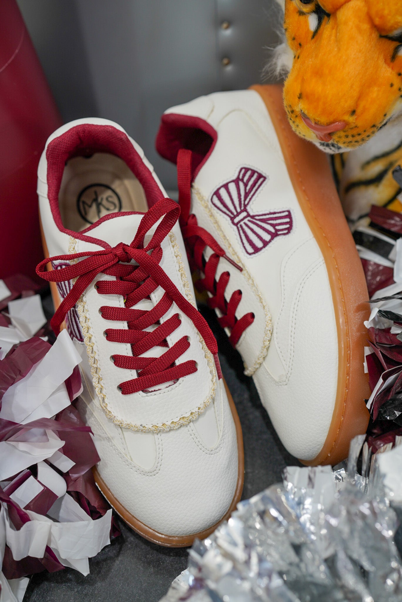 This stylish sneaker features a clean white leather upper paired with a gum rubber sole for a trendy, retro-inspired look. The standout details include deep maroon laces and inner lining, complemented by an embroidered maroon bow on the side. A delicate cream lace trim along the eyelet panel adds a subtle feminine touch, making this shoe both sporty and sweet. Perfect for pairing with casual outfits when you want comfort without sacrificing charm.