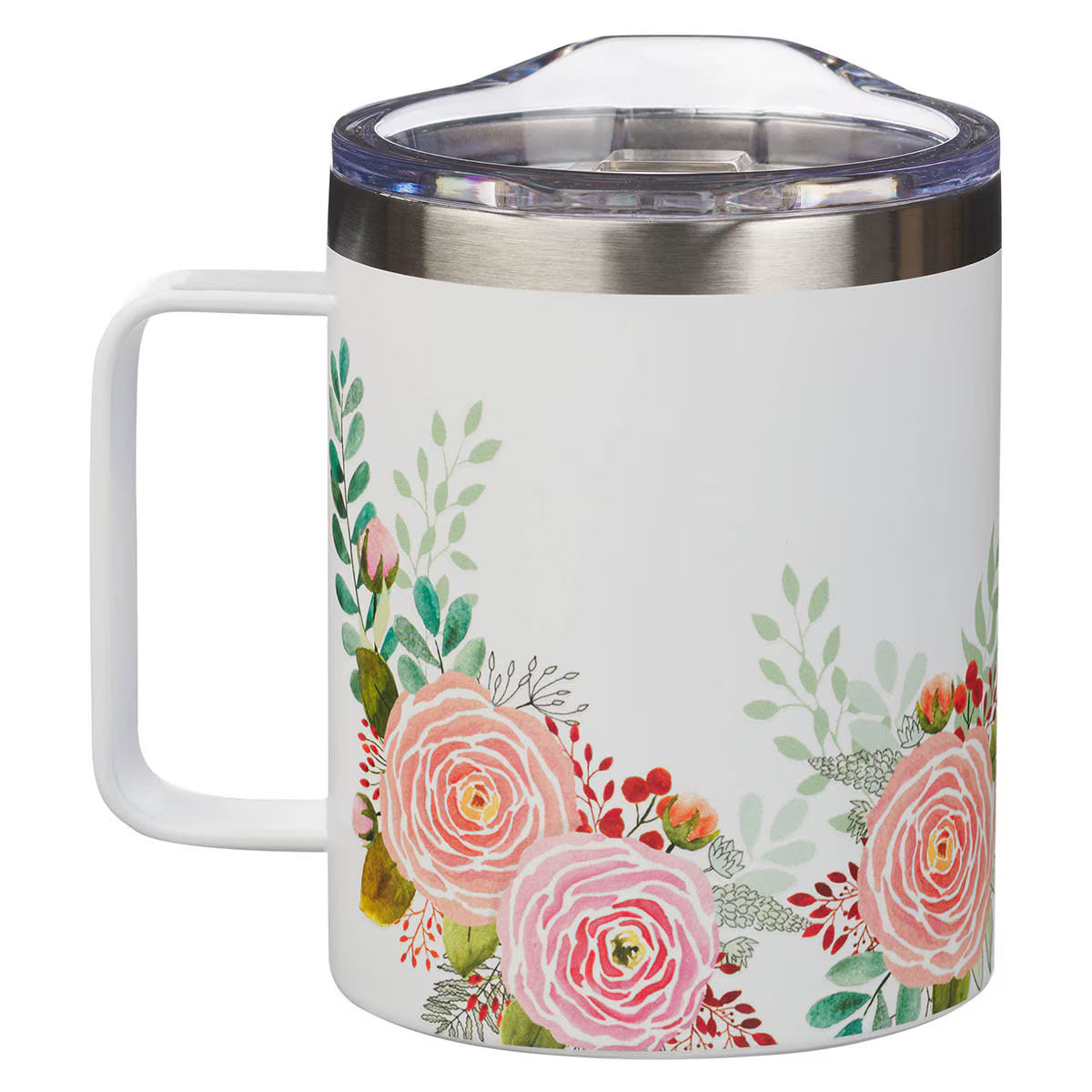The Find Joy Pink Floral Camp-style Stainless Steel Mug is perfect for car trips, work commutes, or camping adventures. Keep your favorite drink hot or cold, and focus on the good things in life as you sip your drink on the go.
