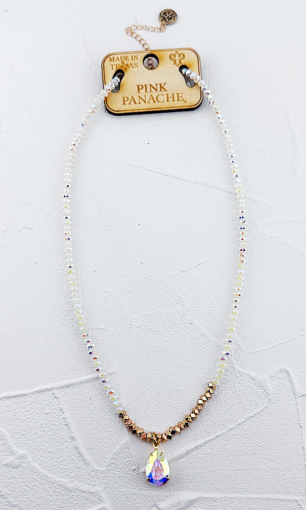 The Juliana Collection is dainty yet full of personality! The photos do not do this collection justice. Iridescent glass beads, golden accents & a fiery iridescent teardrop pendant. Choose from earrings & a necklace.