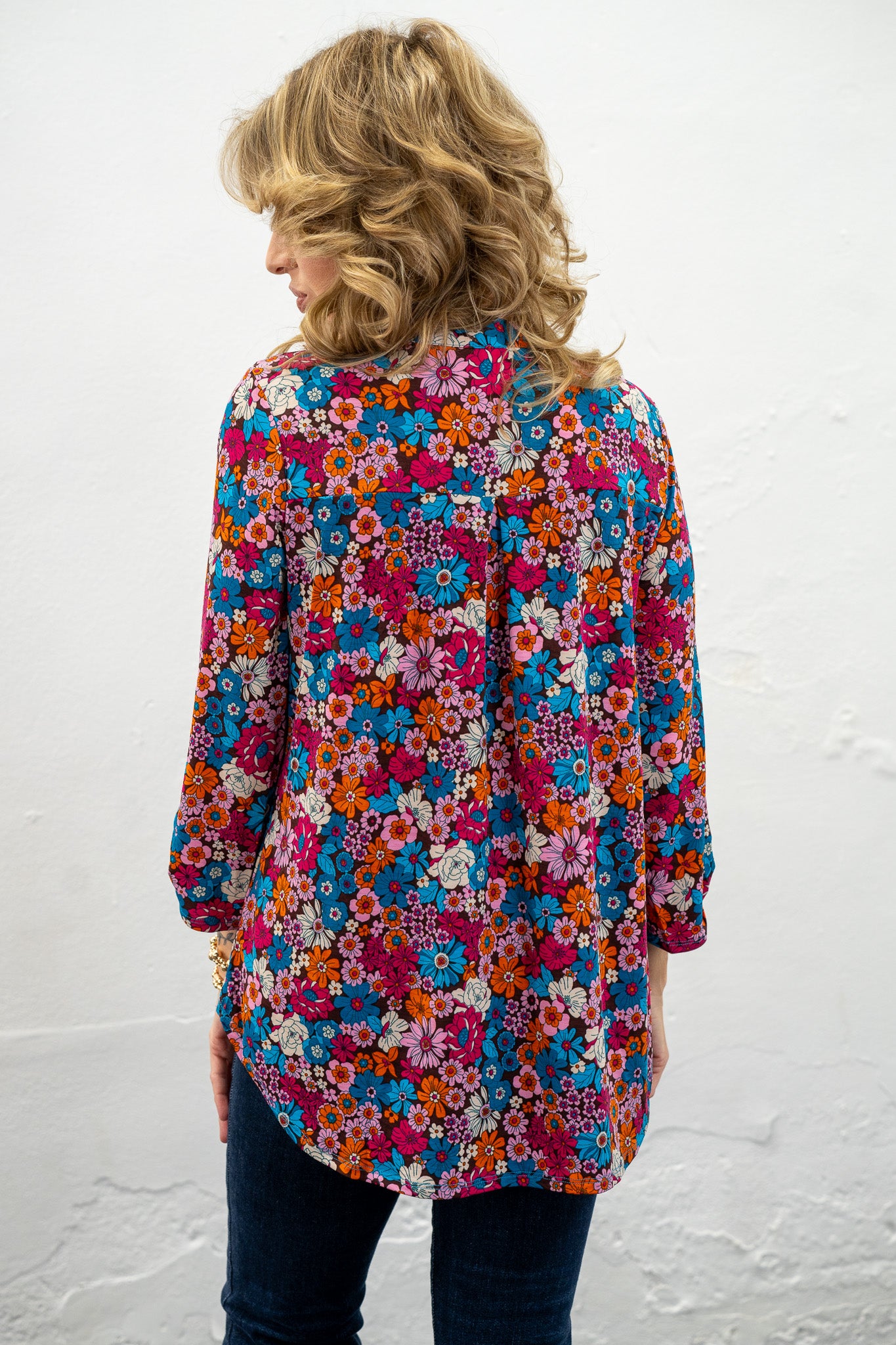 V-neckline, stunning florals and 3/4 sleeves with a gathered button!