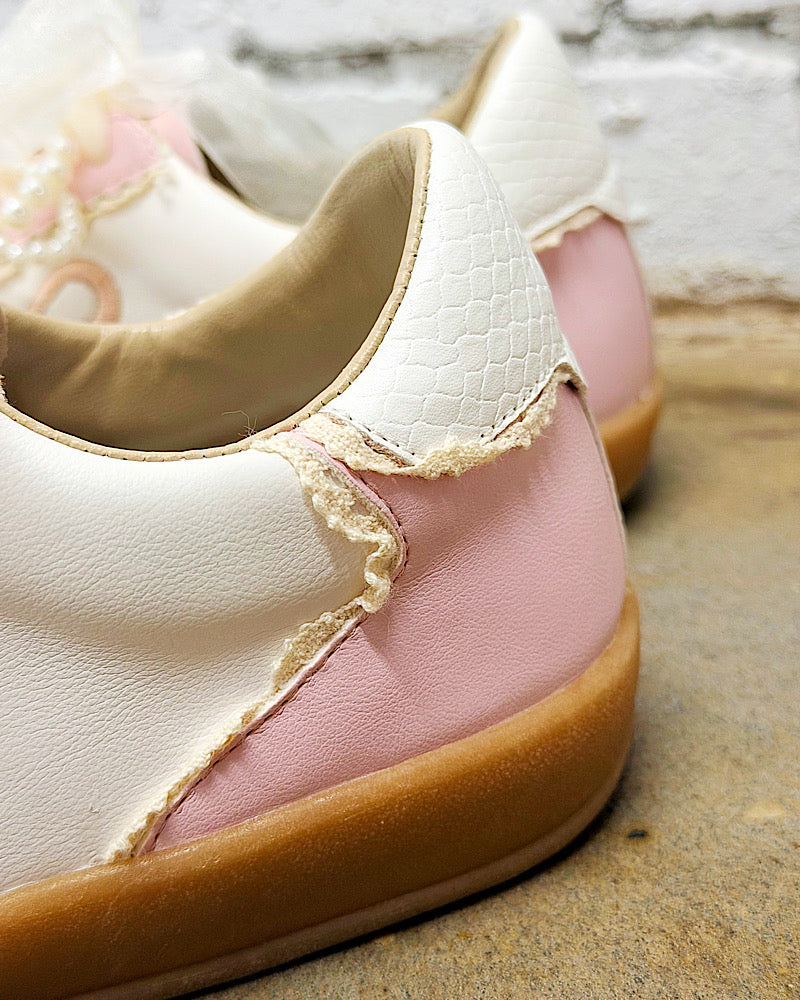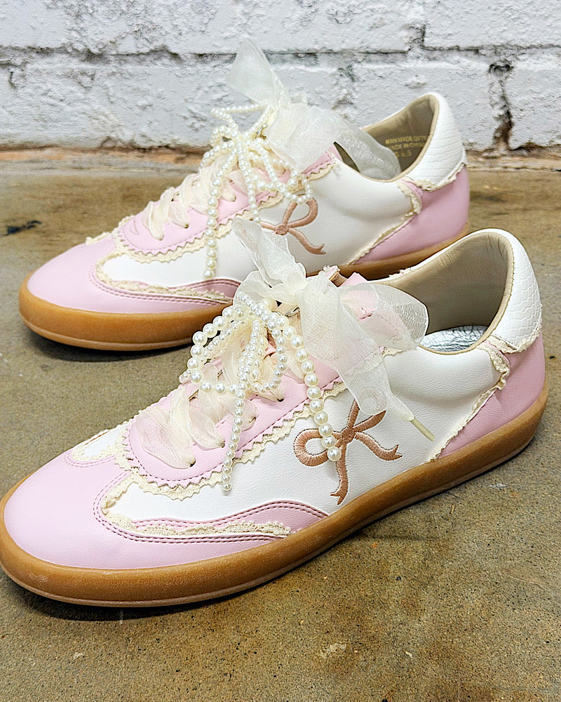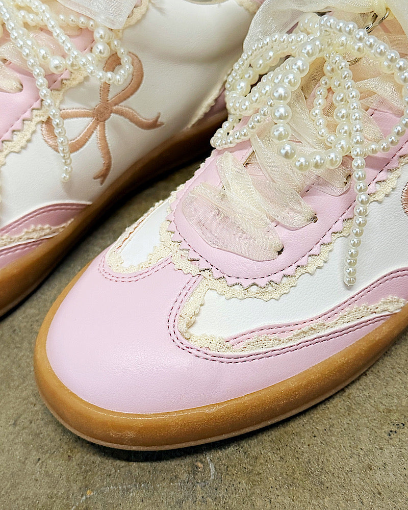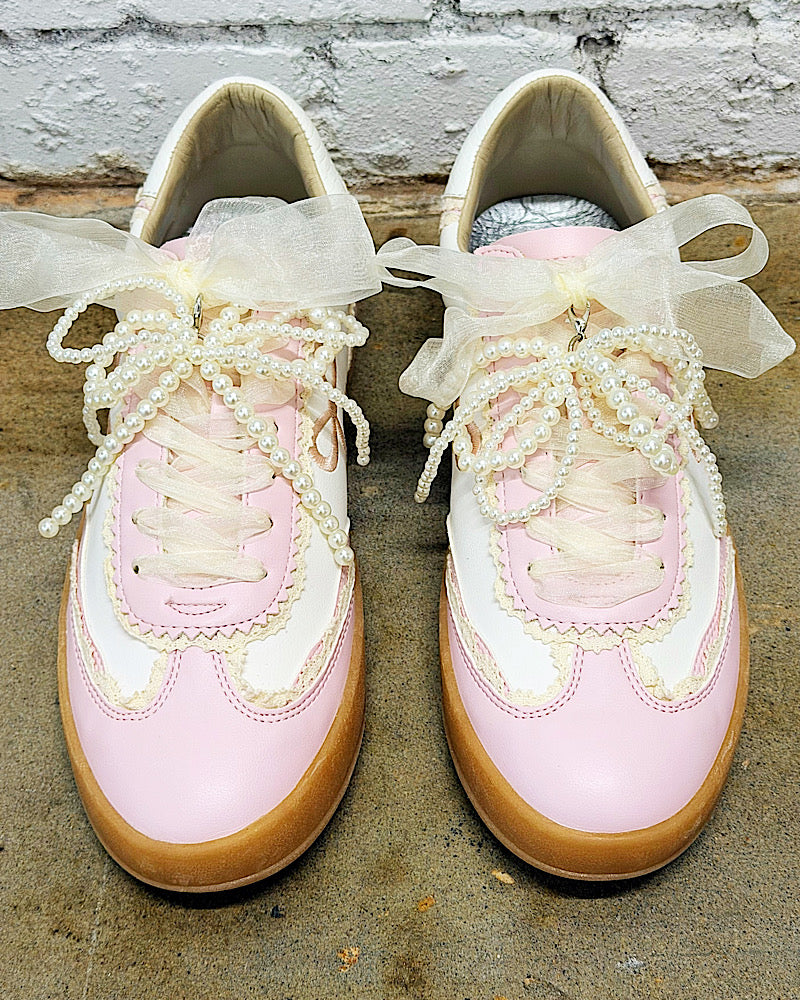 The Juliet Sneaker is where playful romance meets casual chic. Designed in soft cream tones with a gum sole, this sneaker is elevated by whimsical details-sheer ribbon laces, pearl accents, and embroidered bow motifs. Feminine yet wearable, Julie is the perfect pair for adding a touch of elegance to everyday outfits or dressing down with a polished twist.