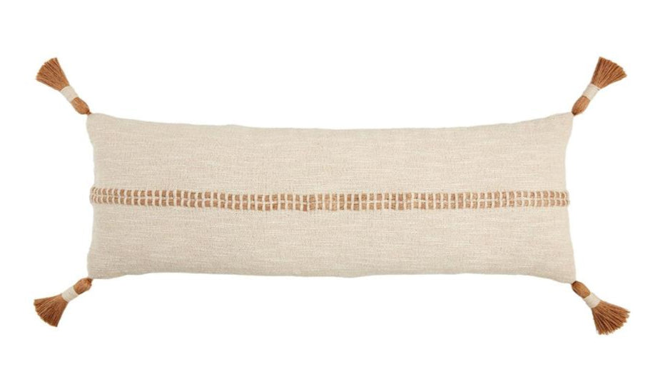 Knobby textured cotton pillow with woven jute stripes and jute side tassels.