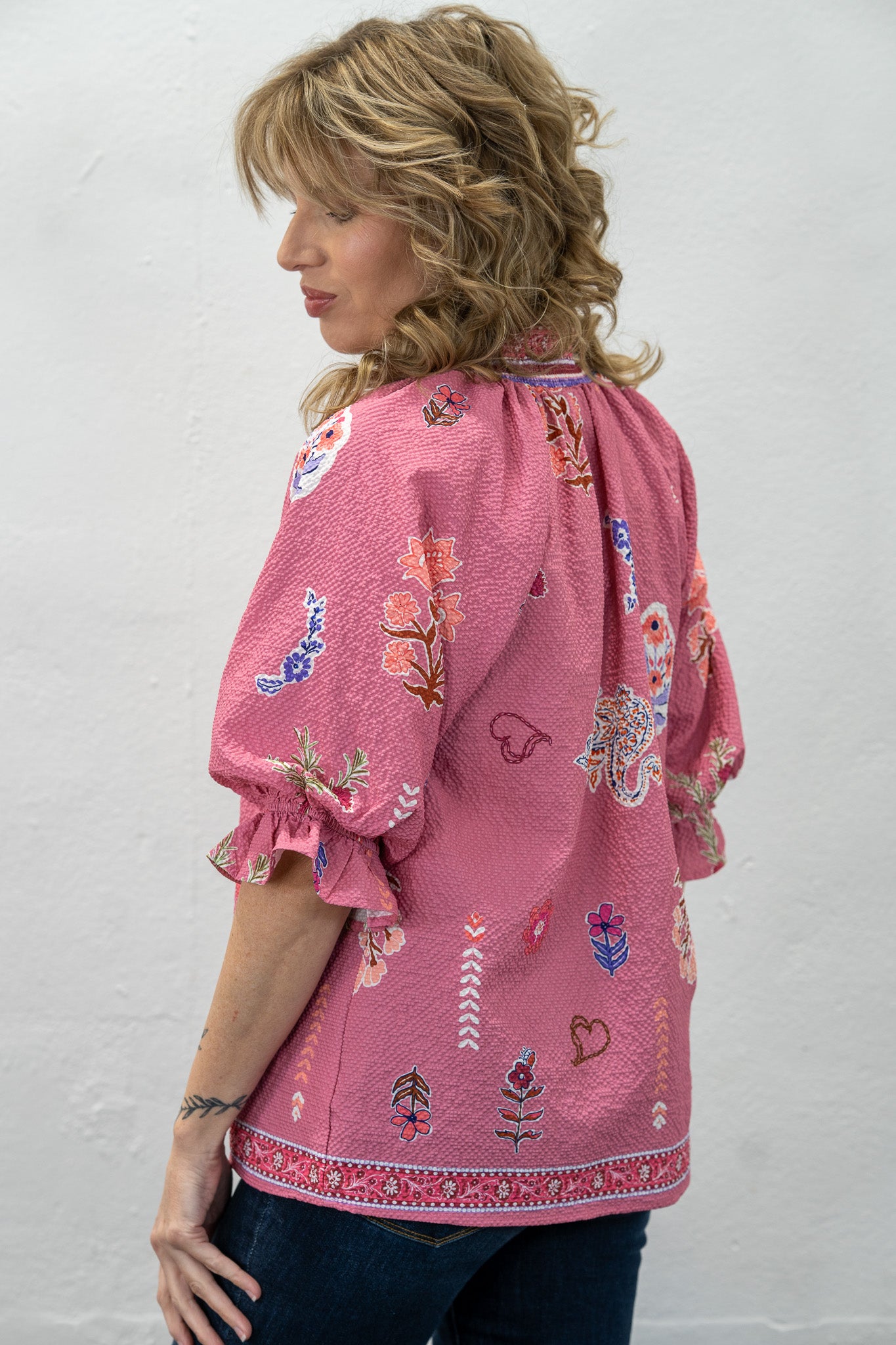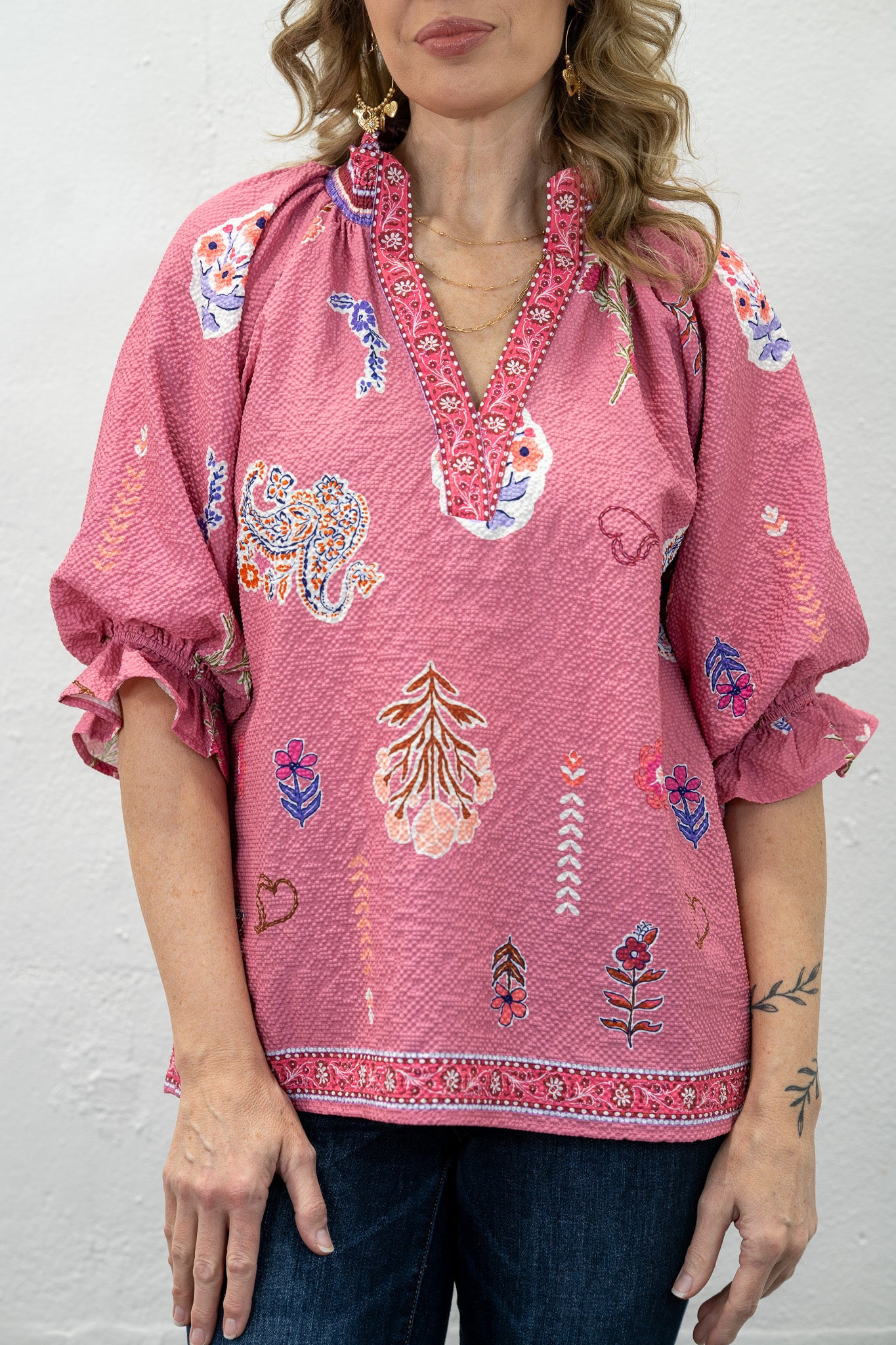 Our Kathleen Top is fabulous! Made from textured, seersucker style fabric with bright, bold florals, paisleys and other cool details! Smocking around the collar and elastic around the sleeves make for an easy, fun fit!