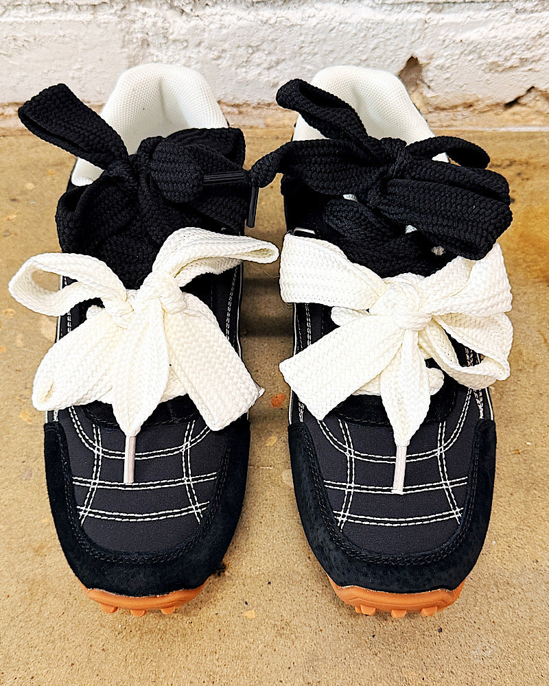 A modern twist on a classic athletic silhouette, these trainers come in a sleek black suede with contrasting white laces. Featuring a contrasting oversized bow-tie lace detail and a durable gum sole, perfectly blending comfort and unique fashion.
