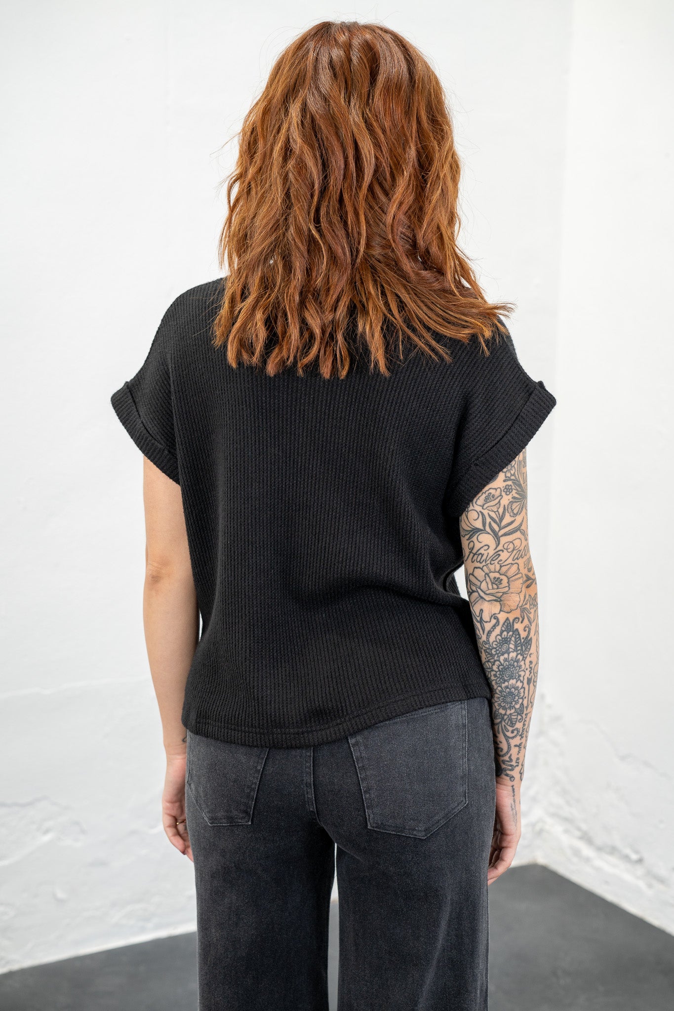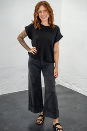 Lana is for the comfy babes! Round neckline, cropped hemline (hits right at the top of the hips) and a rolled cuff sleeve.