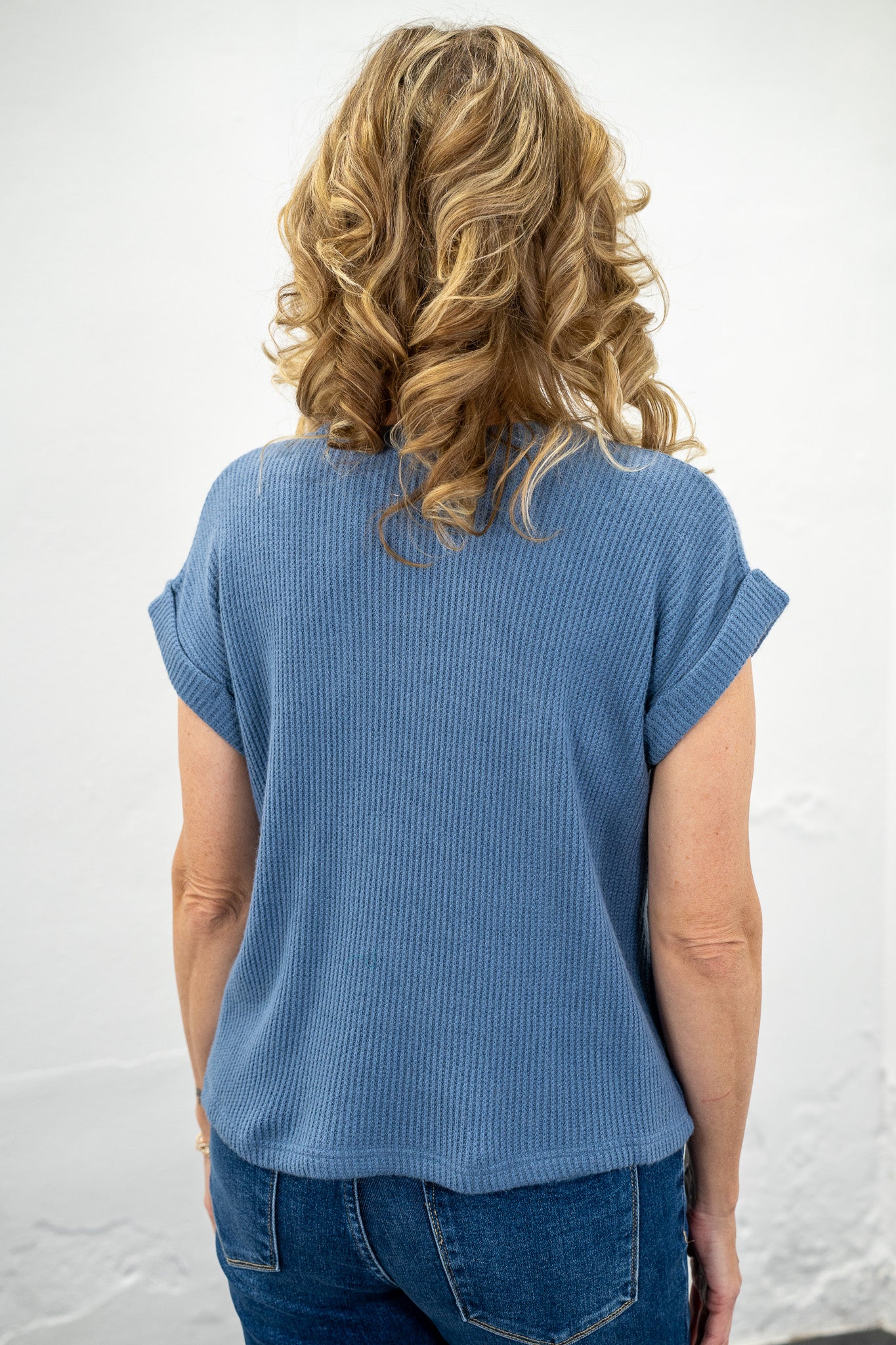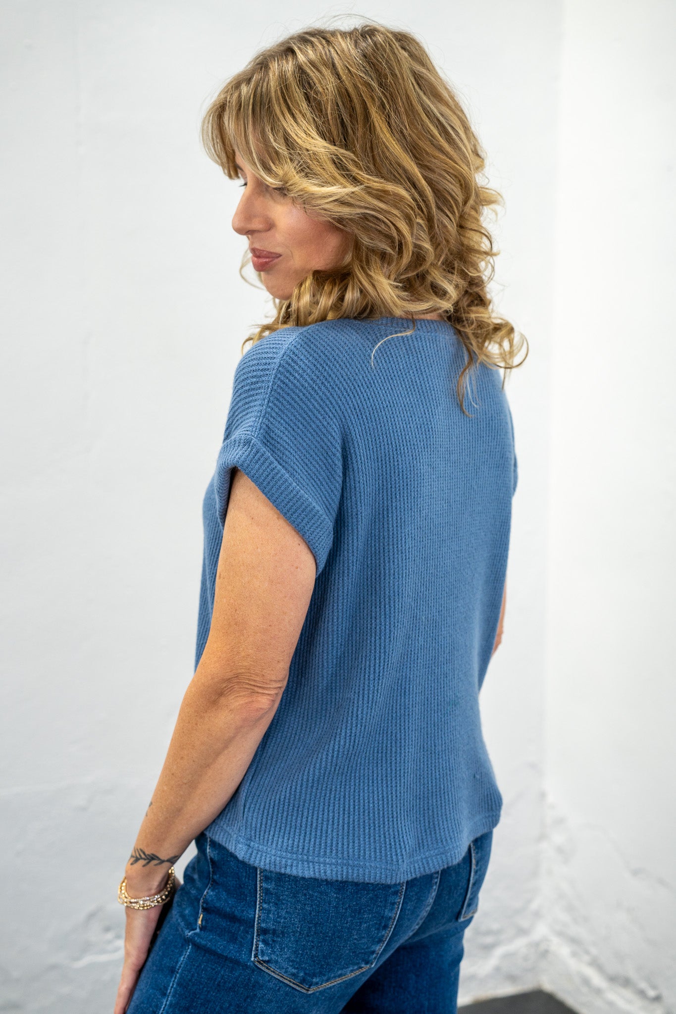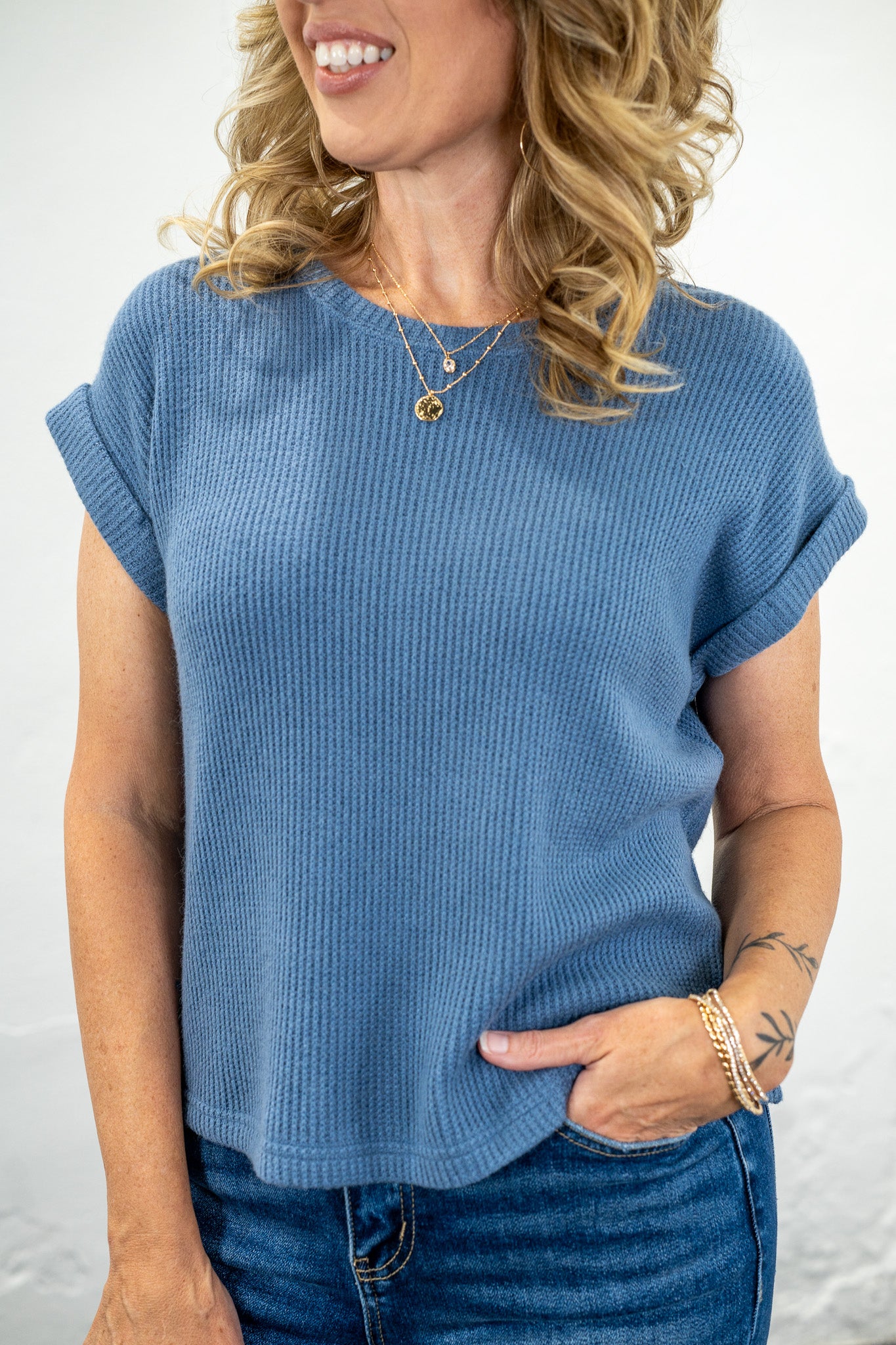 Lana is for the comfy babes! Round neckline, cropped hemline (hits right at the top of the hips) and a rolled cuff sleeve.
