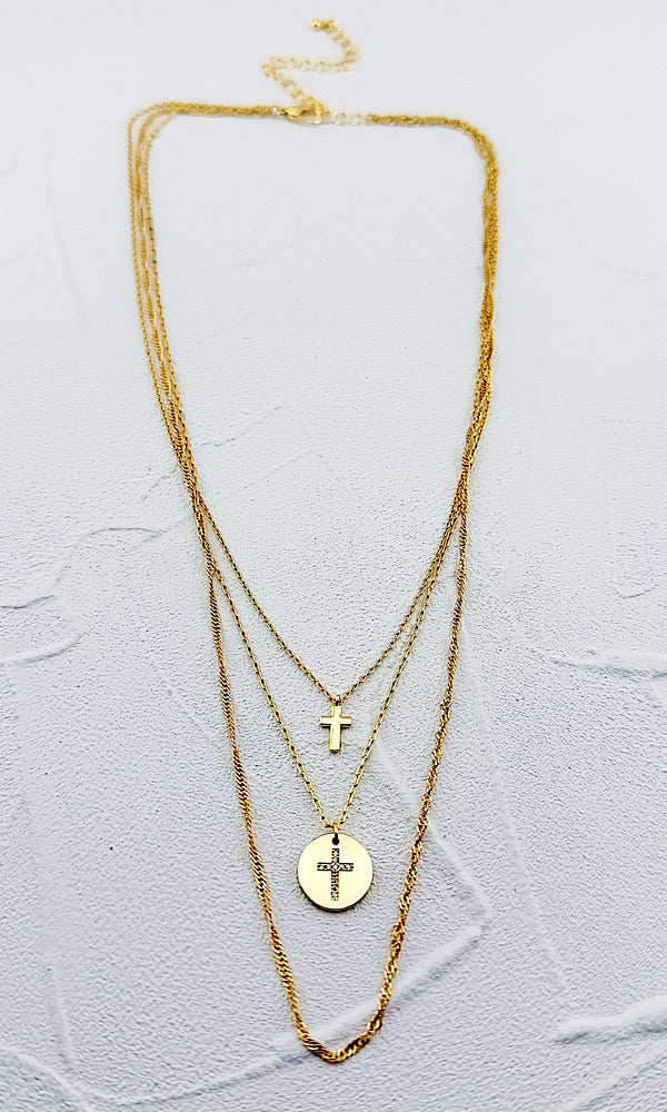 Our Lexi triple layered necklace features 3 layers of shimmery gold chains and 2 dainty cross pendants. Adjustable!