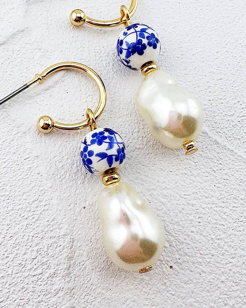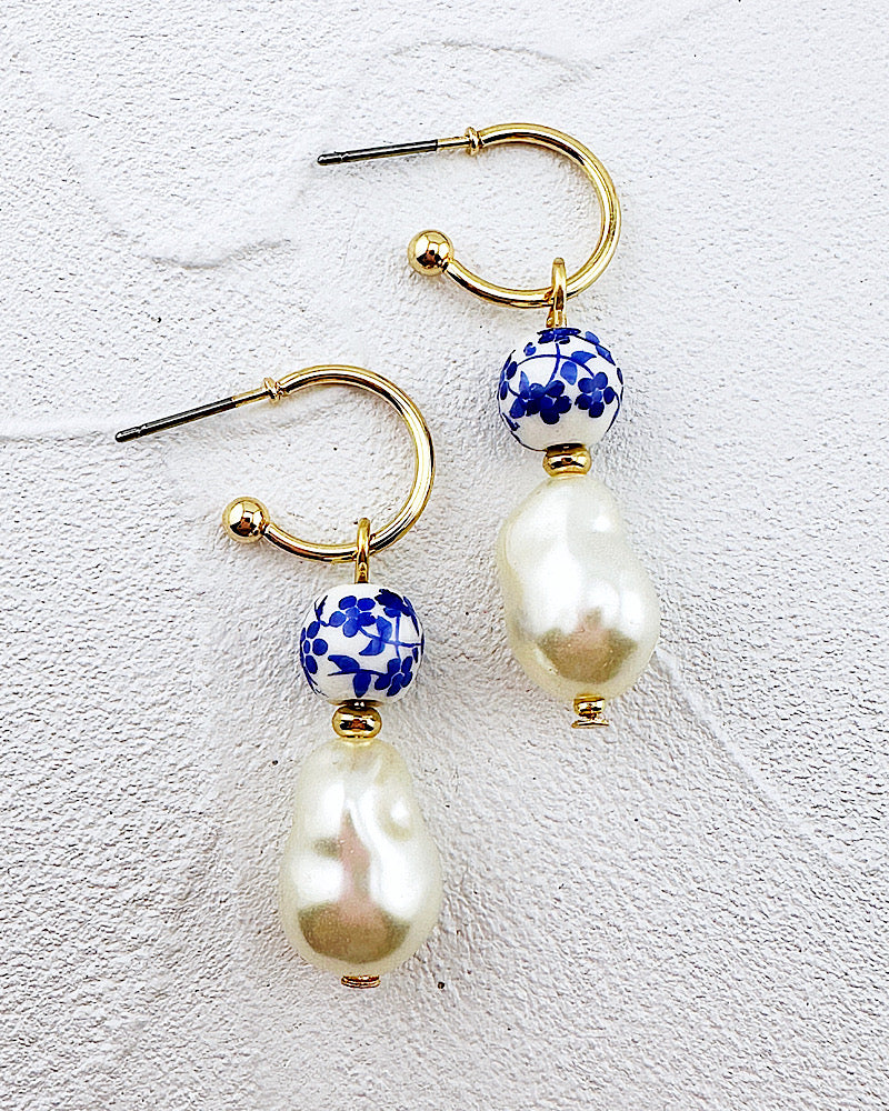 Macie Hugger Hoops - Little golden hugger hoops accented with a floral painted ceramic bead & pearl drop.
