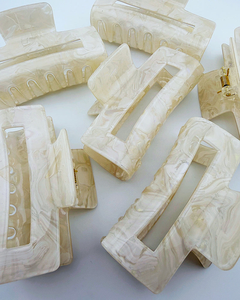 Our favorite claw clips are back in a neutral color!! Large & lightweight with a nude marble finish acrylic. The perfect wear everyday clip. 3-1/4"