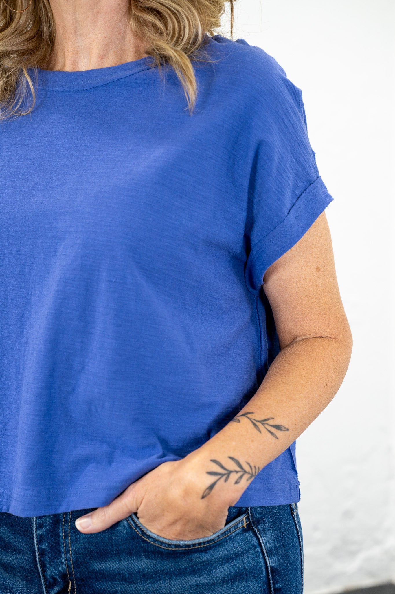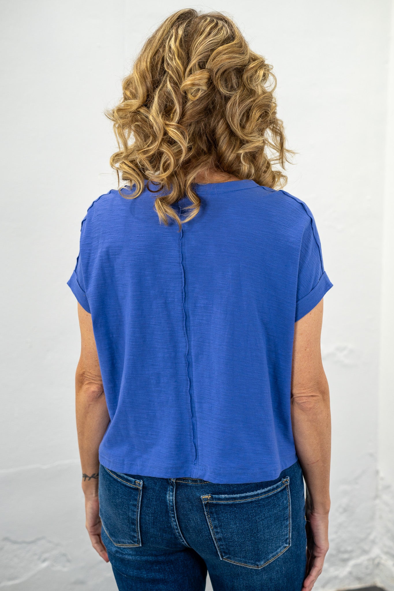 Stretchy cotton/knit fabric with a loose fit and a cropped hemline!
