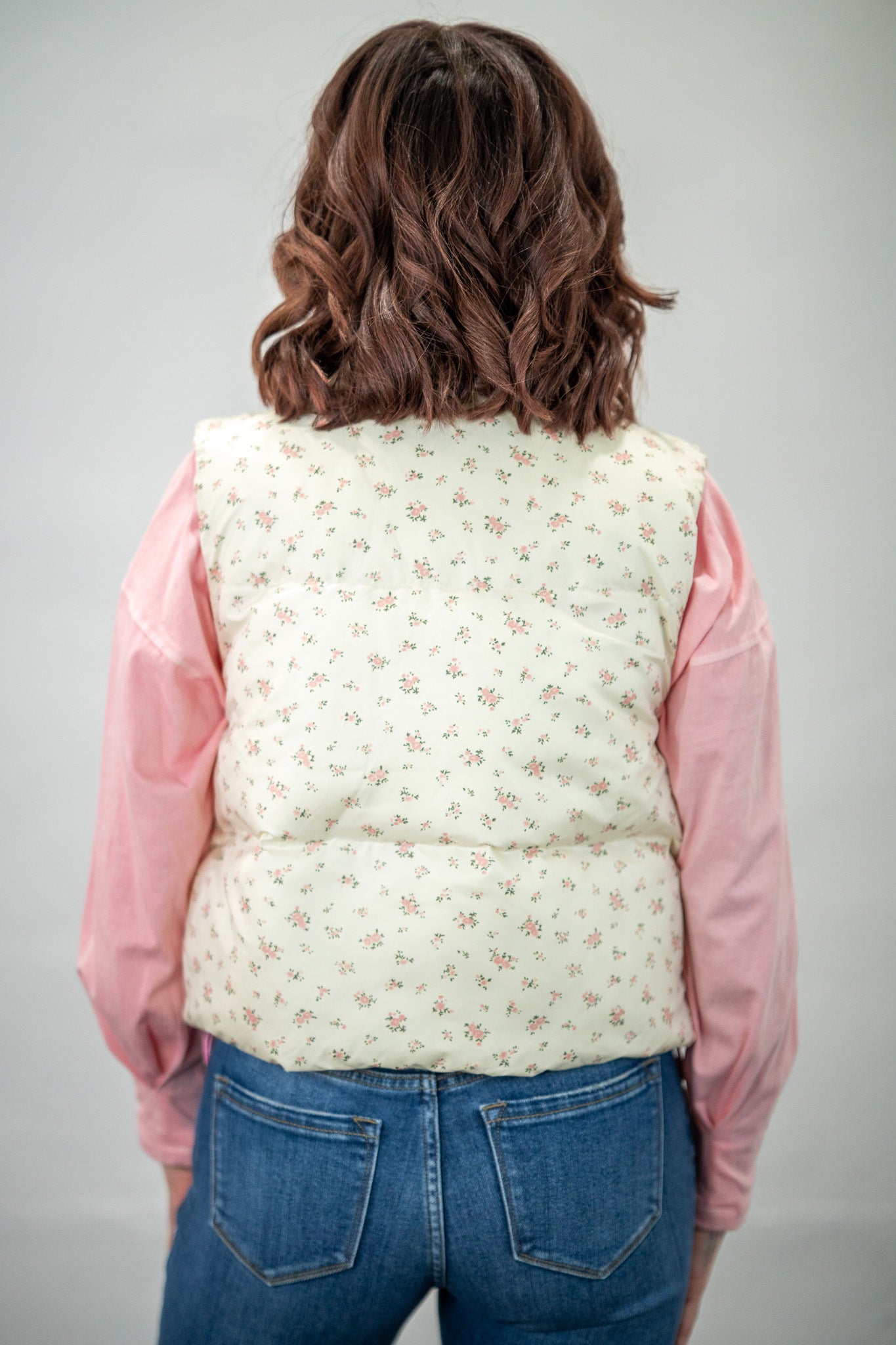 Soft feminine florals adorn this darling puff vest giving you elegant, romantic charm while keeping you warm and comfy!