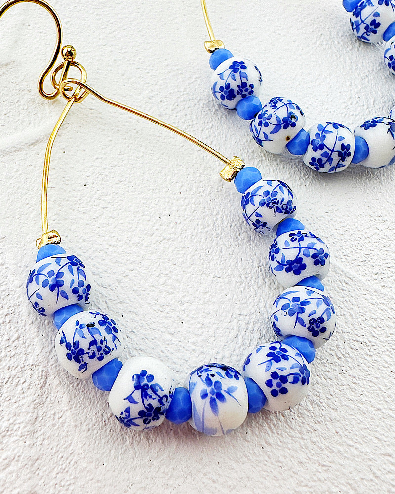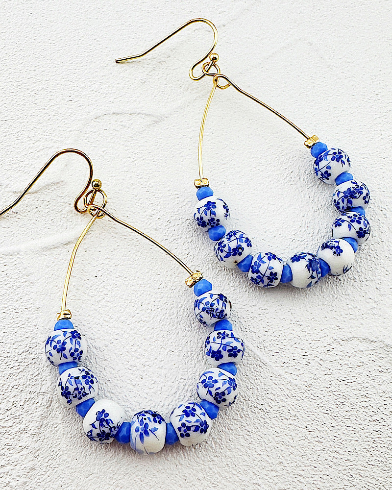 Mia Teardrops - Lightweight golden wire teardrop beaded with little blue & white floral ceramic beads. French wire style, 2-1/8" drop.