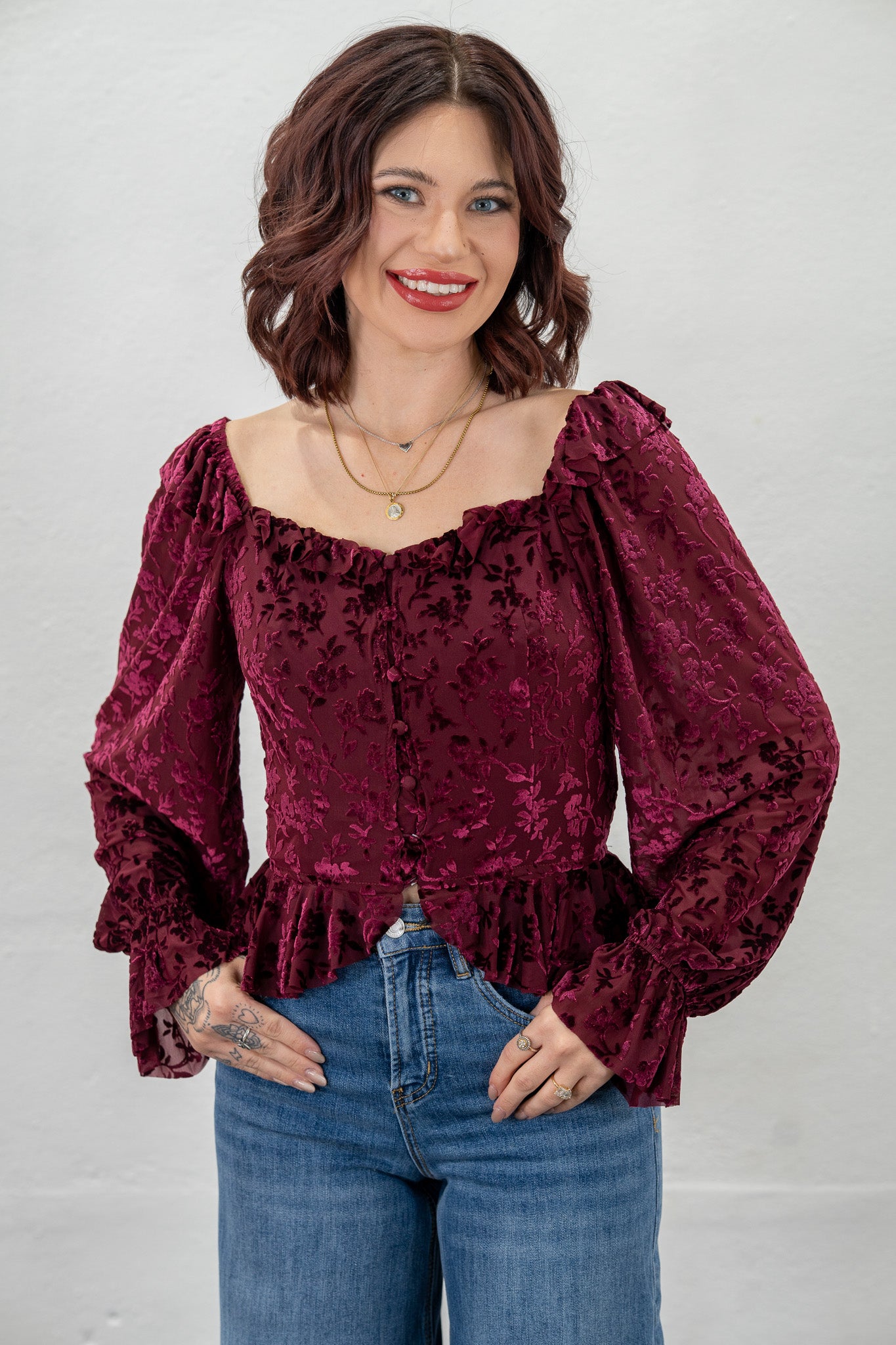 Romantic with a hint of edge, our Midnight Petals Burnout Top showcases a sticking floral velvet burnout pattern.