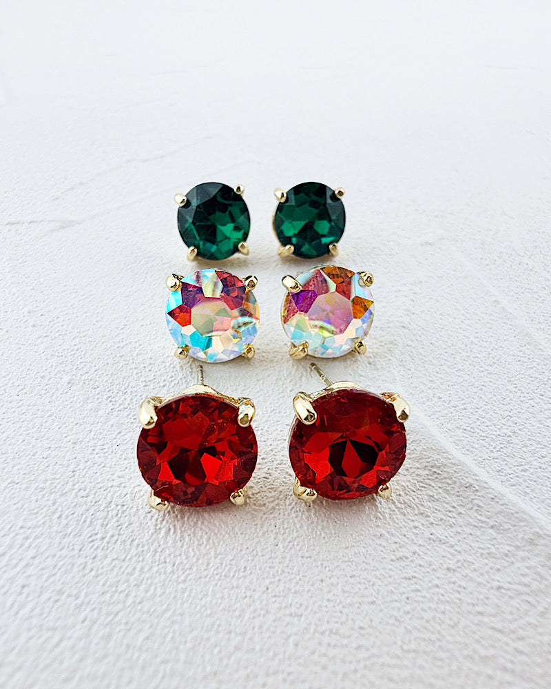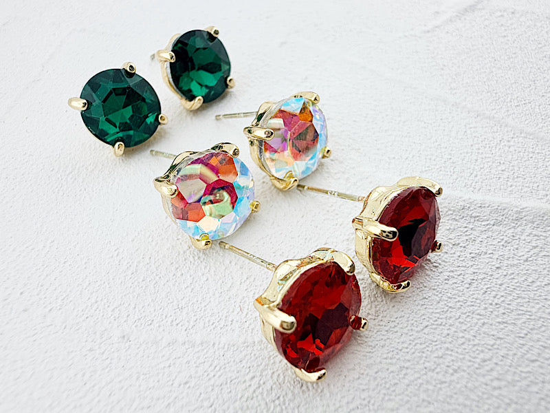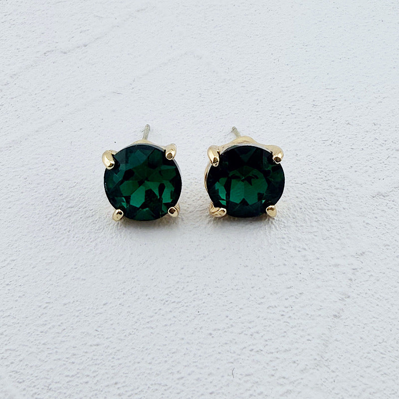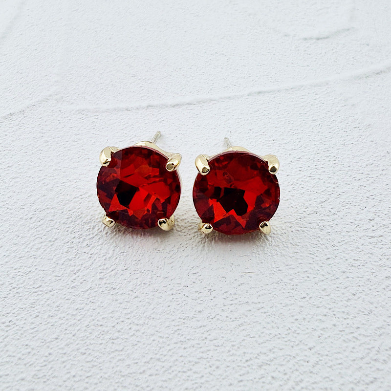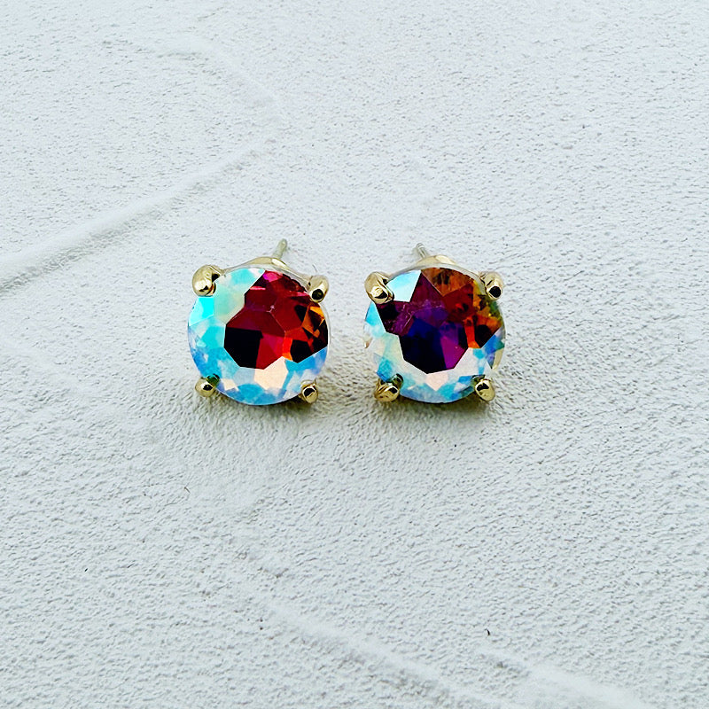 Sasha is full of fire and now available in a smaller size. The perfect solitaire studs with golden prongs. Faceted & full of sparkle. Post style, 3/8" diameter.