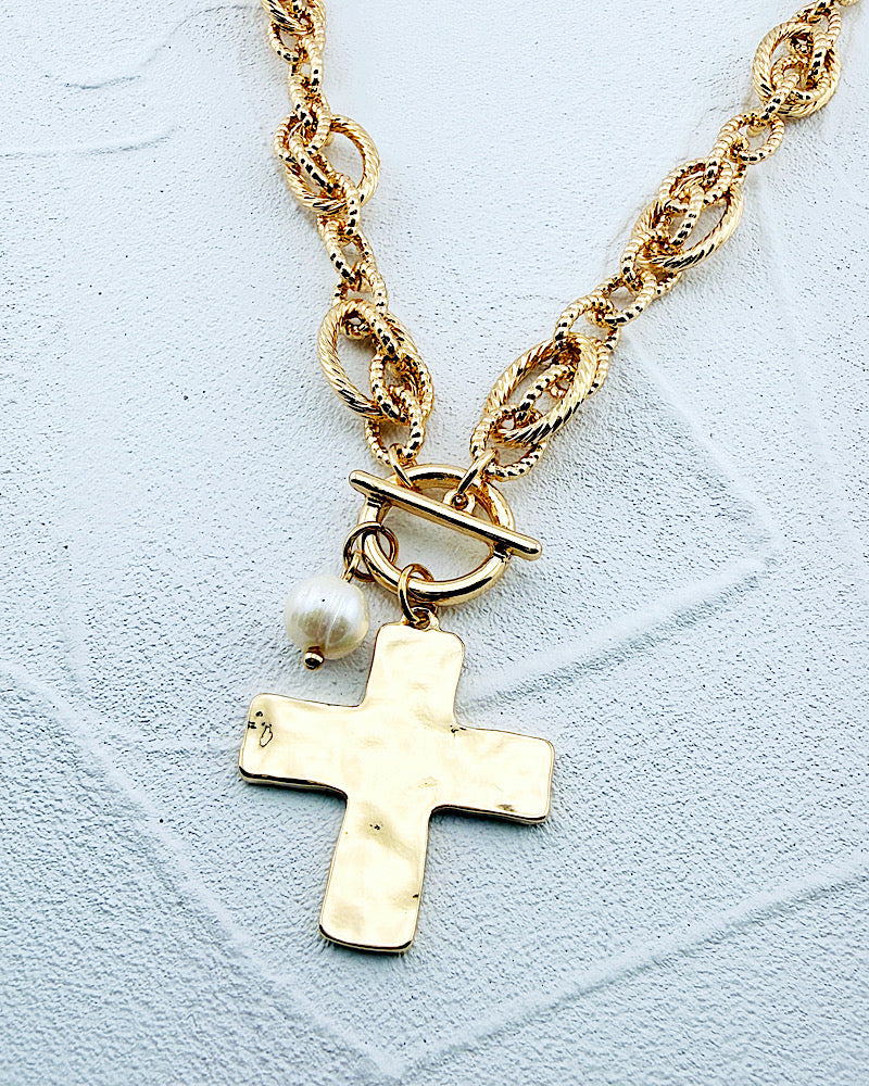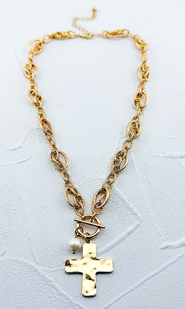 Shimmer & shine when you wear our Mindy necklace. Featuring textured metallic chain links & a hammered cross charm with pearl dangle. Faux front toggle, lobster clasp, adjustable from 16-19"
