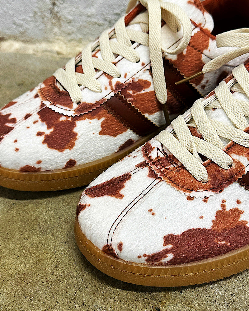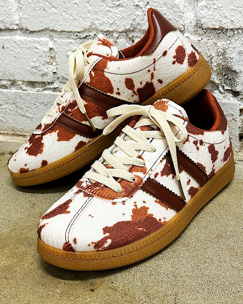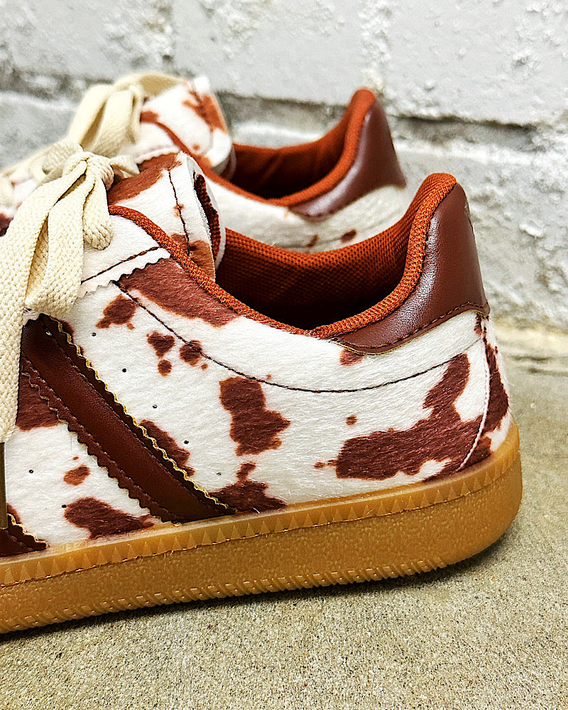 Get ready to kick it with our cow print sneakers. These cuties pair perfectly with denim & dresses. Featuring a neutral color palette, faux cow hide, cushy gum soles & zig zag trim.