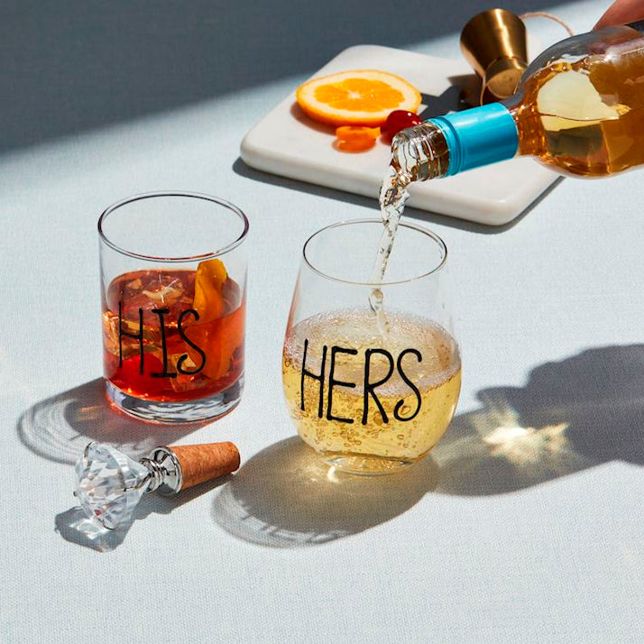 3-piece set. Hand-painted stemless "HERS" wine glass and "HIS" double old fashioned glass comes with cork bottle stopper with large "diamond" topper.