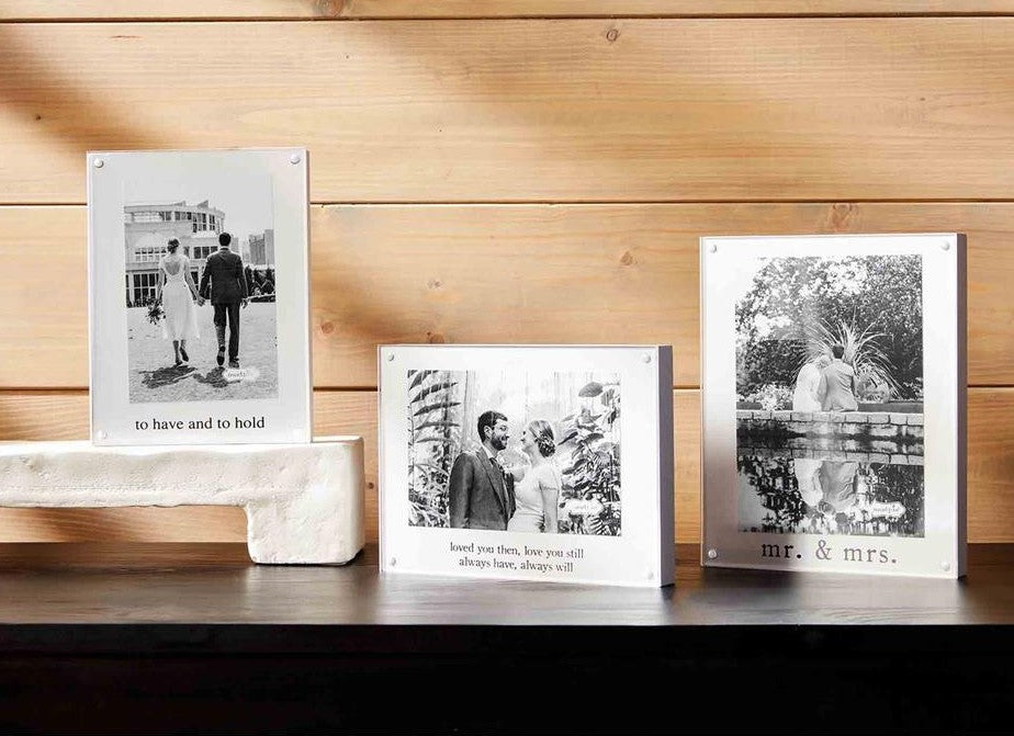 Magnetic wood block frame features acrylic magnet surface to hold 4" x 6" or 5" x 7" photo in place.