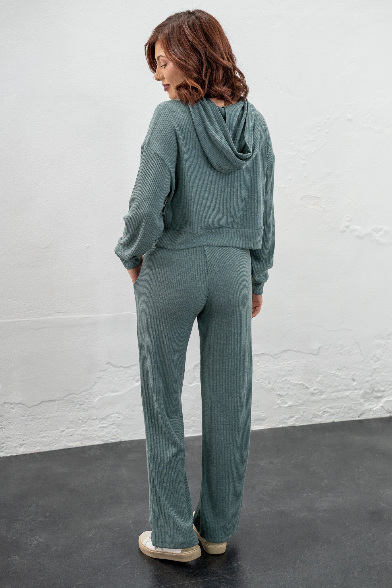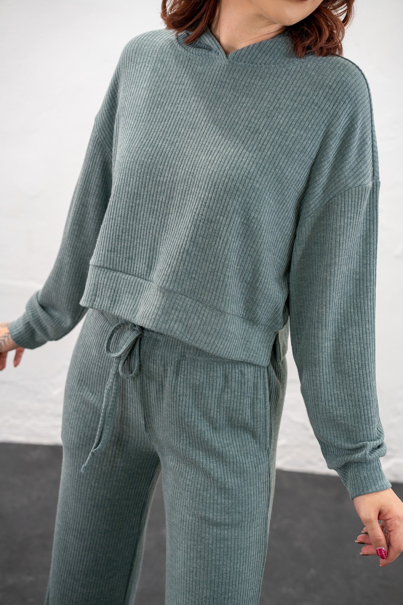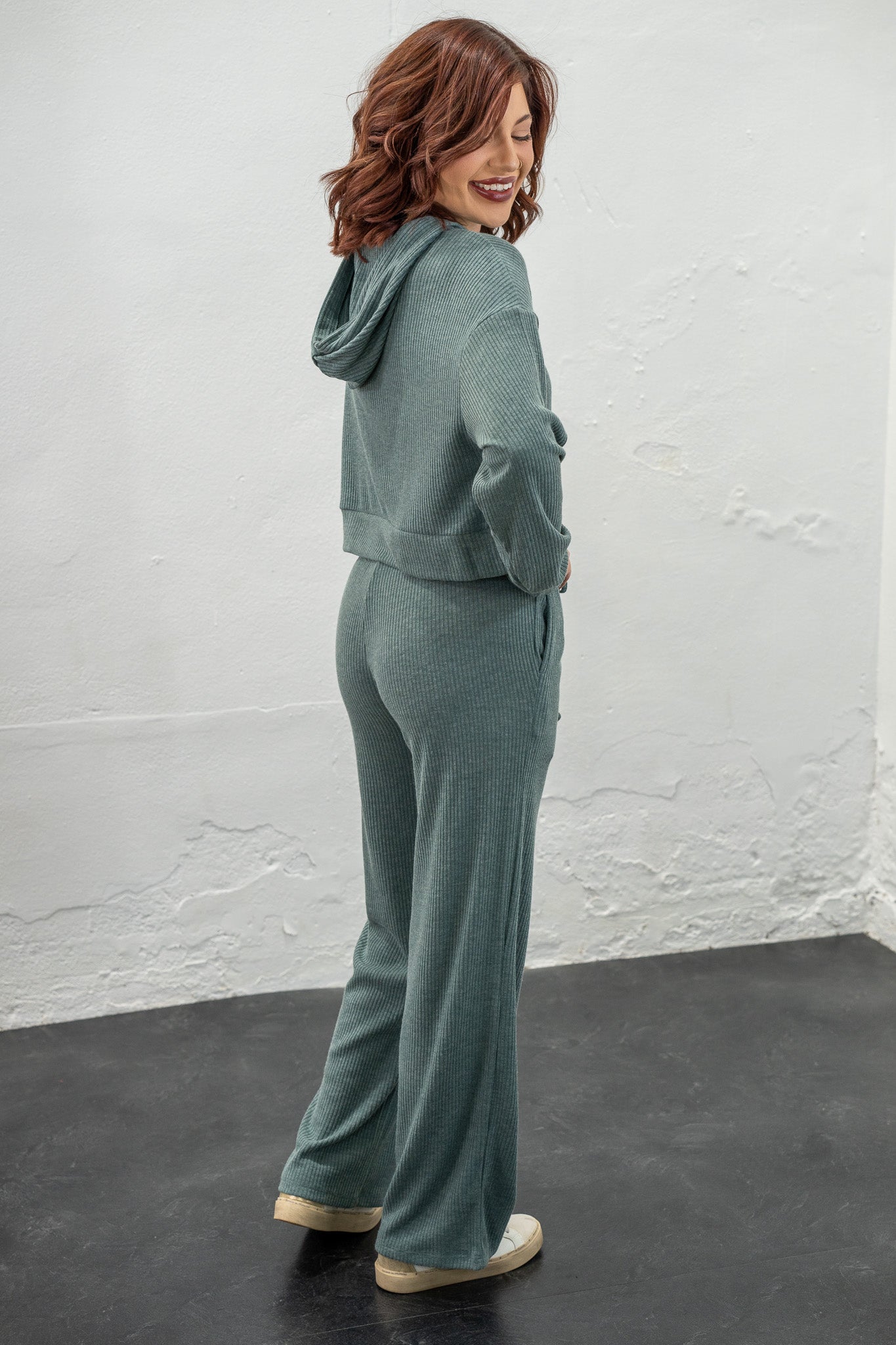 Set includes ribbed top and ribbed lounge pants which include a drawstring waistband and pockets!