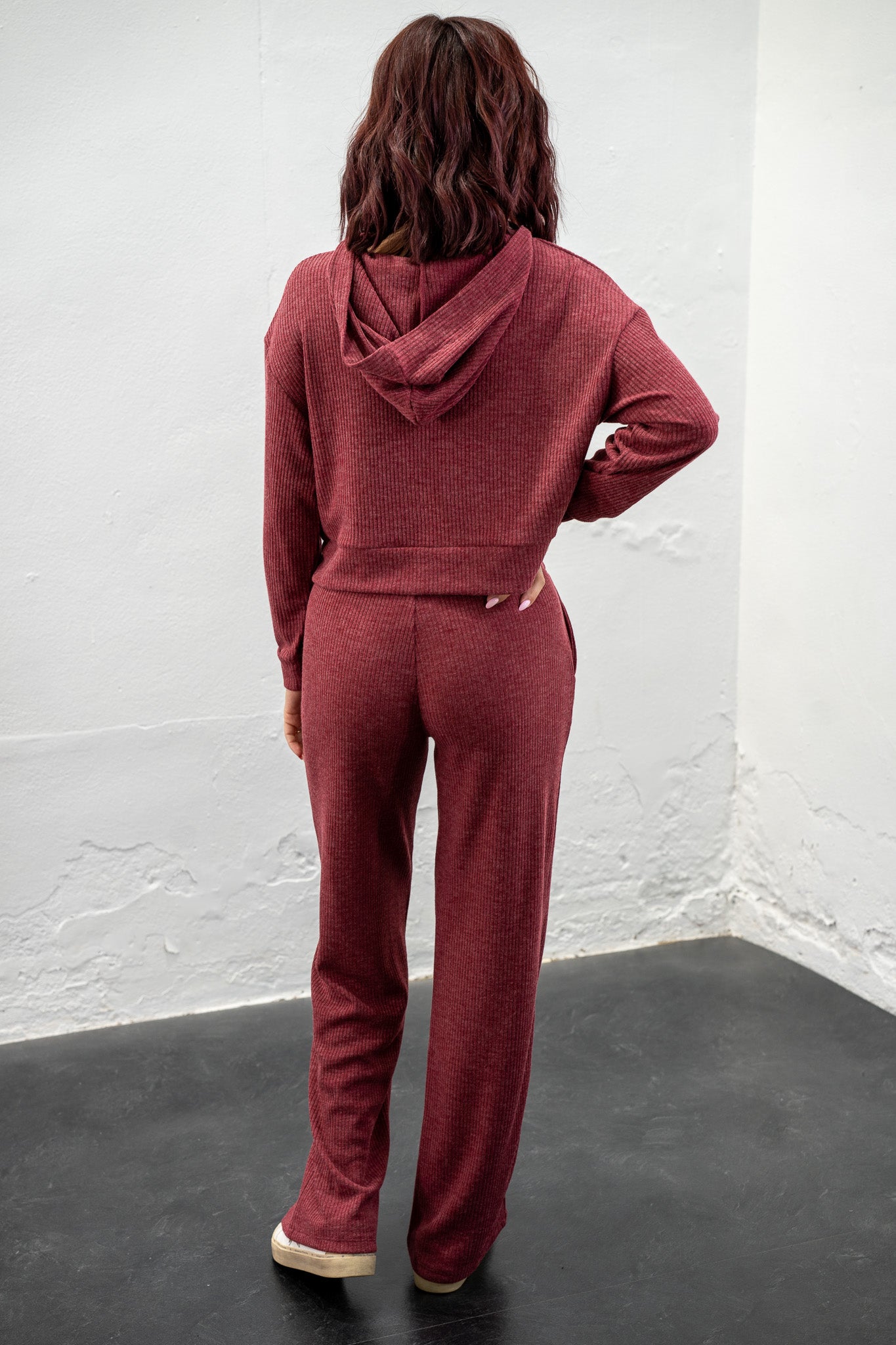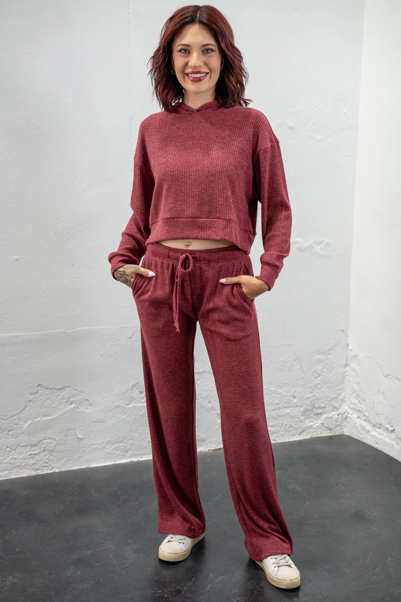 Set includes ribbed top and ribbed lounge pants which include a drawstring waistband and pockets!