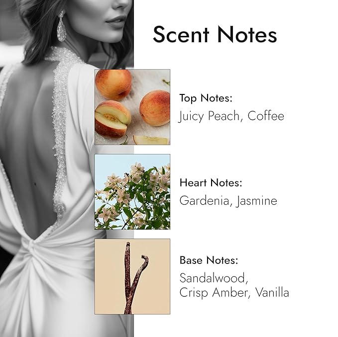 - A sensual & evocative fragrance. With notes of fresh peach, feminine jasmine, vanilla, warm sandalwood, and coffee.